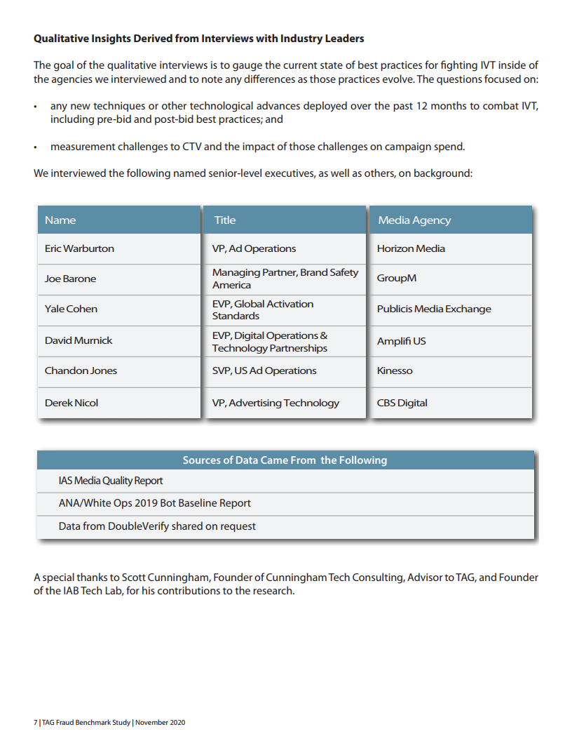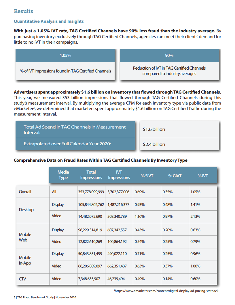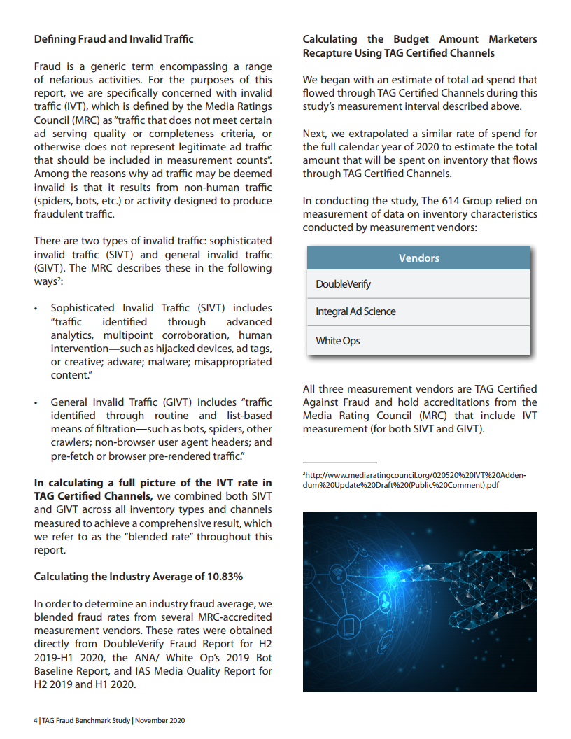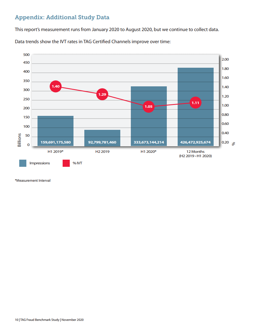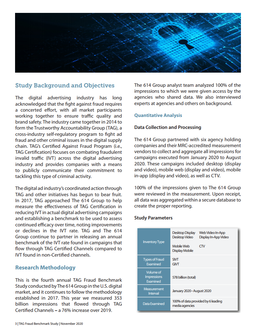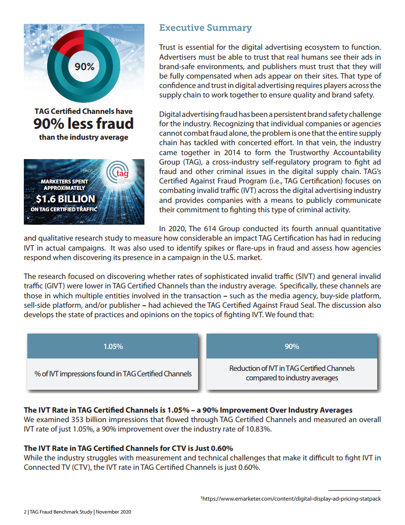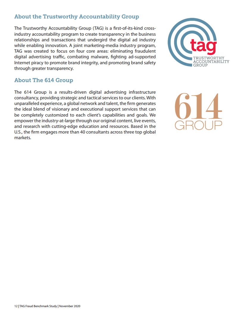 2020年,614 Group进行了第四次年度定量和定性研究,以评估TAG认证对降低广告中IVT(无效流量)的影响。它还可用于识别欺诈峰值,并评估广告代理商在发现IVT时的反应。