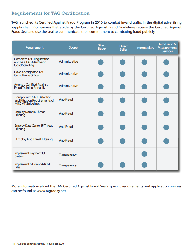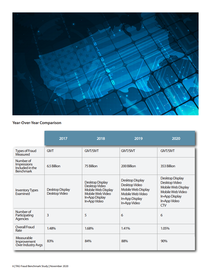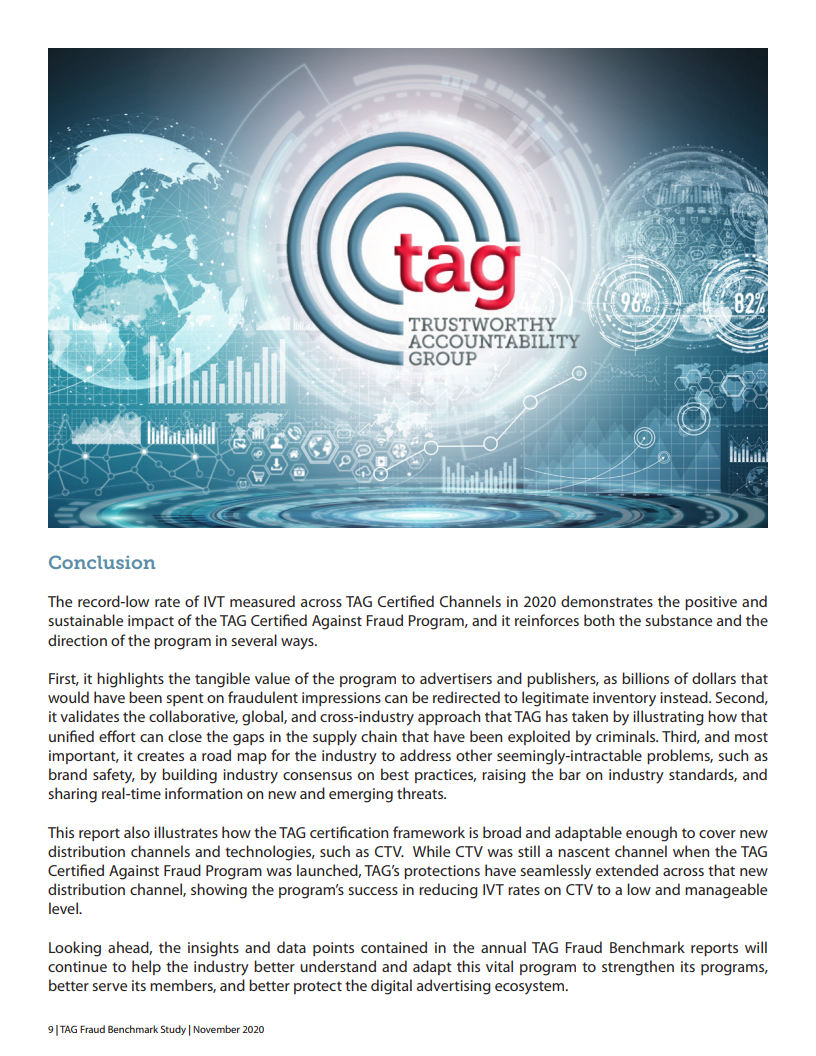 犯罪分子通常会在混乱和动荡时期获利,但TAG成员对积极的反欺诈标准的承诺继续在打击欺诈方面取得强劲进展。今年,广告预算减少,可衡量的业务成果变得越来越重要。研究证明了使用TAG认证的渠道如何对底线产生积极影响。我们可能永远不会完全消除广告流量欺诈,但是,行业的持续合作将使欺诈率保持在可预测和可管理的水平。