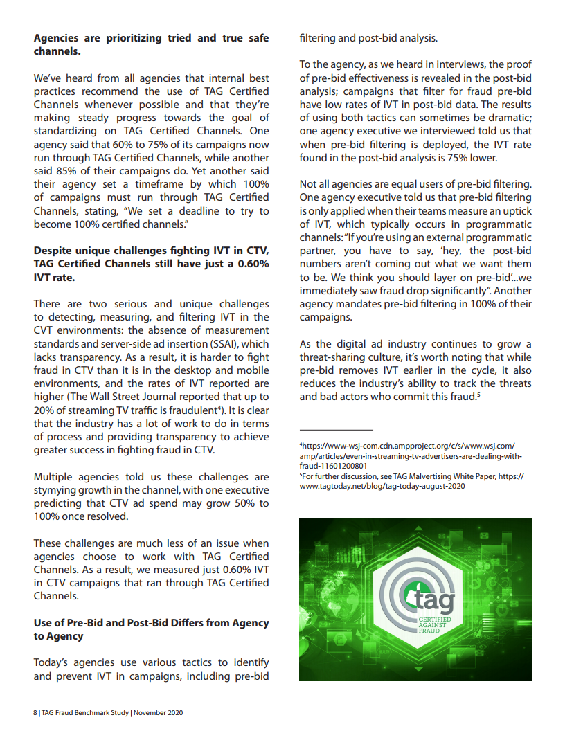 尽管该行业在测量和技术挑战方面苦苦挣扎,这使其很难与IVT相抗衡。但是,TAG认证的CTV渠道的IVT率仅为0.60%。