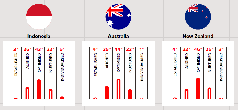 研究发现,尽管新加坡的企业拥有最高的数字体验成熟度,但该地区的整体得分却落后于2/5,部分原因是他们尚未意识到其营销技术体系的全部潜力。