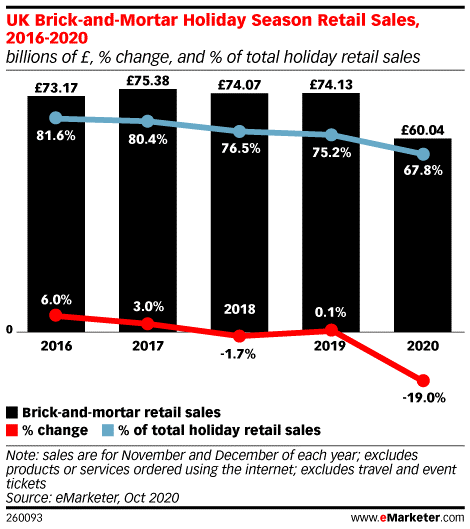 这些问题和店内购物的担忧会一直延续到圣诞节期间,因此在线购物将承受季节性需求的压力。与此同时,到11月再次实施封锁将进一步推动这一趋势。今年,电子商务假日季节的零售销售额将达到285.1亿英镑(363.8亿美元),比去年增长16.7%,占2020年英国假日销售总额的32.2%。