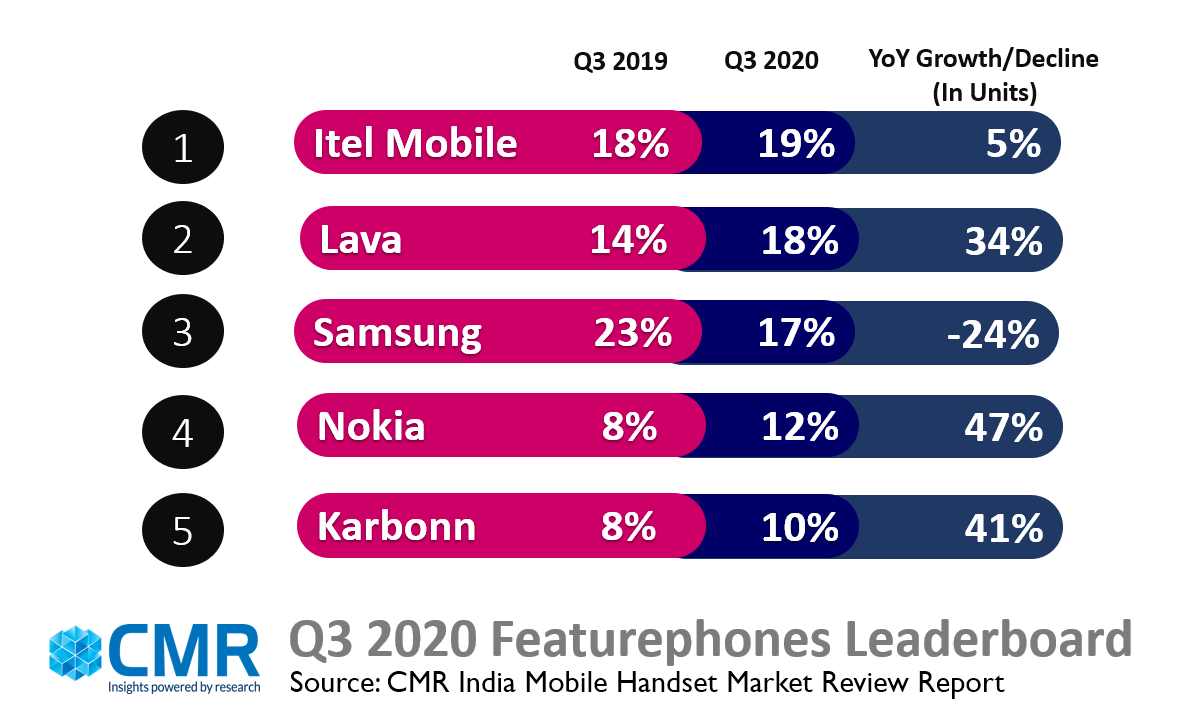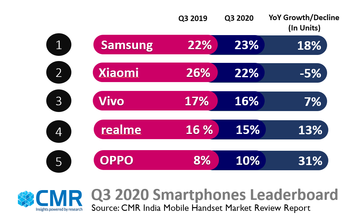 根据CMR 2020年第三季度手机市场报告,印度智能手机出货量反弹,并在2020年第三季度达到历史最高水平,同比增长14%。三星取代了小米,成为印度第一大智能手机品牌。