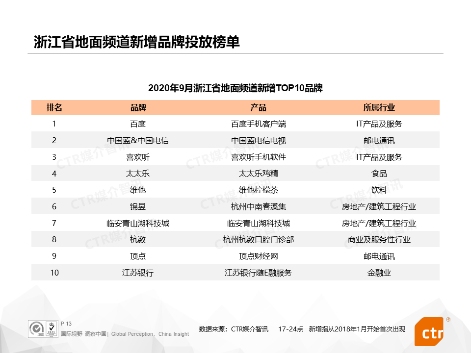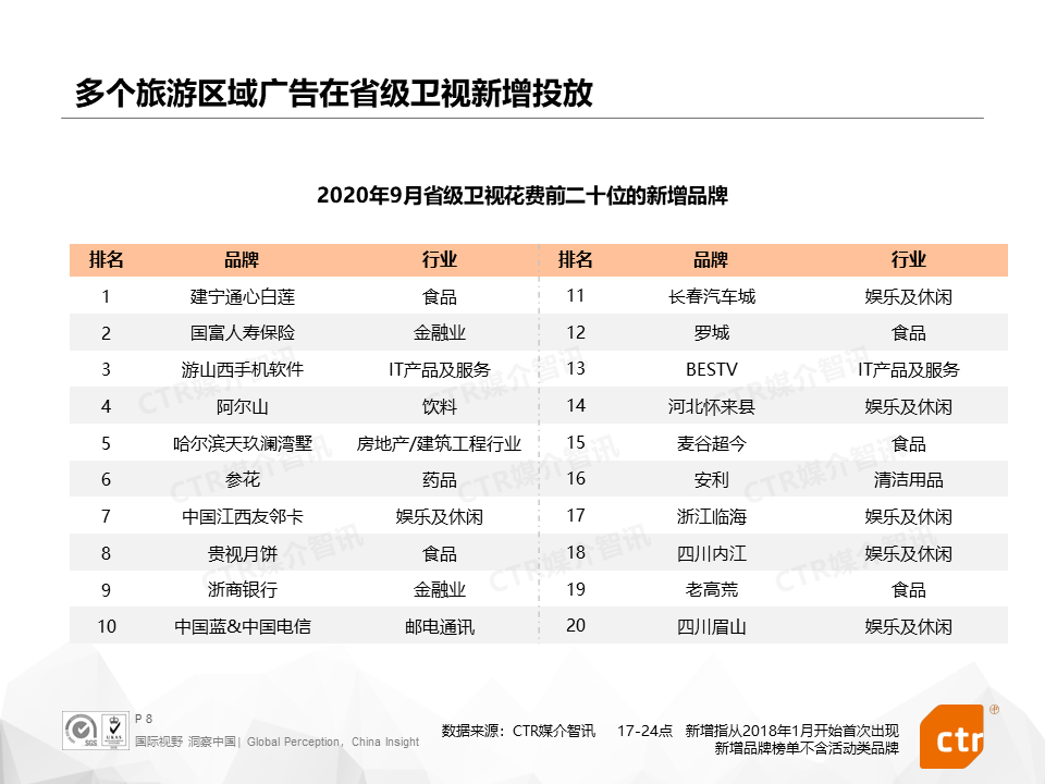 根据CTR媒介智讯的数据显示,2020年9月,电视广告刊例花费同比微降1.5%,电视广告花费同比逐步回归到疫情前的水平。头部行业较为稳定,连续多月由食品、饮料、药品、活动类、酒精类饮品行业构成。其中,食品、活动类的电视广告持续增长环比和同比均增长超过两位数。食品行业中多个品类的广告花费增长明显,特别是保健食品、方便食品、零食糖果、食用油增长多且投放量大。饮料行业在电视广告投放同比减少,但从品类来看,重点品类如婴幼儿奶粉、果蔬汁、原奶的广告花费提升,茶饮料、碳酸饮料、蒸馏水/矿泉水、酸奶等品类的广告花费缩减。