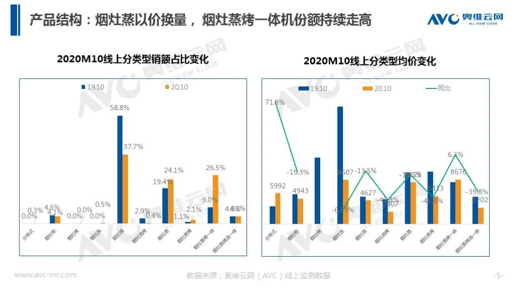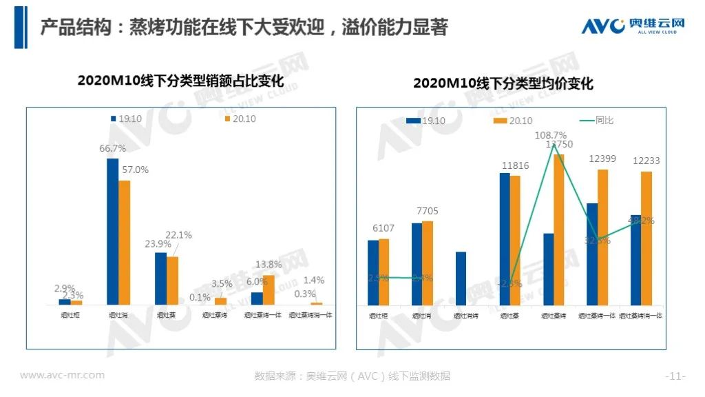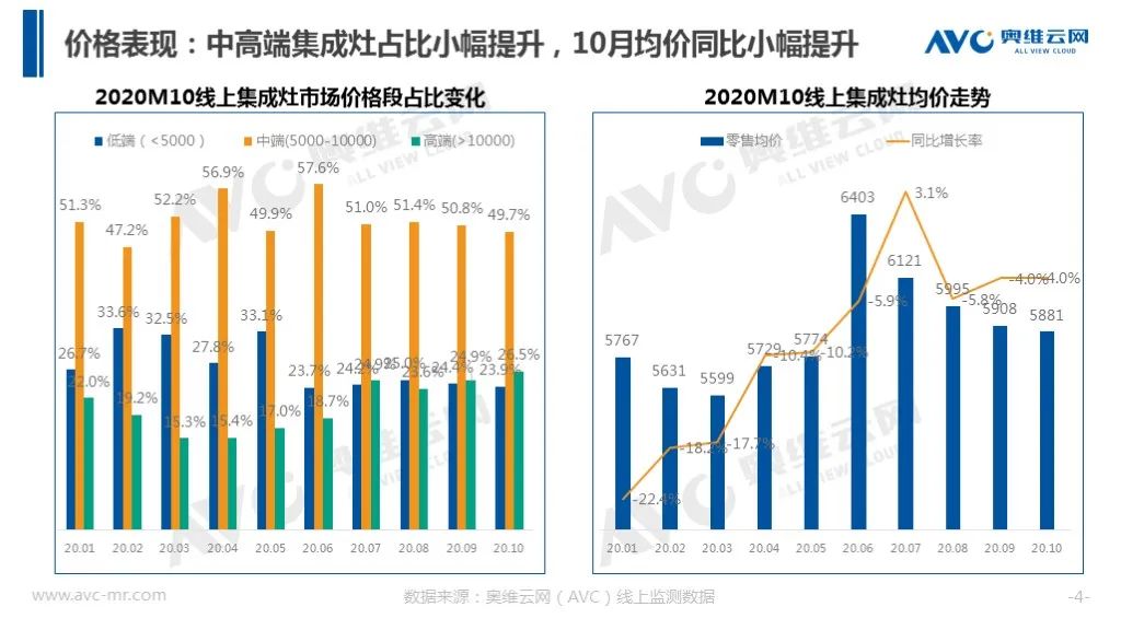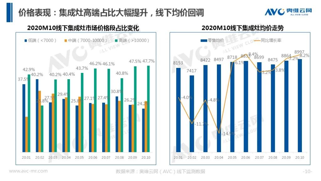 根据奥维云网(AVC)线上监测数据显示,十月线上高端占比有小幅提升,均价同比小幅下滑4%。在十一活动中,商家降价力度较强,消费者也愿意购买较高端的集成灶产品。线下市场高端占比提升,均价同比也大幅提升,高端化进程显著。