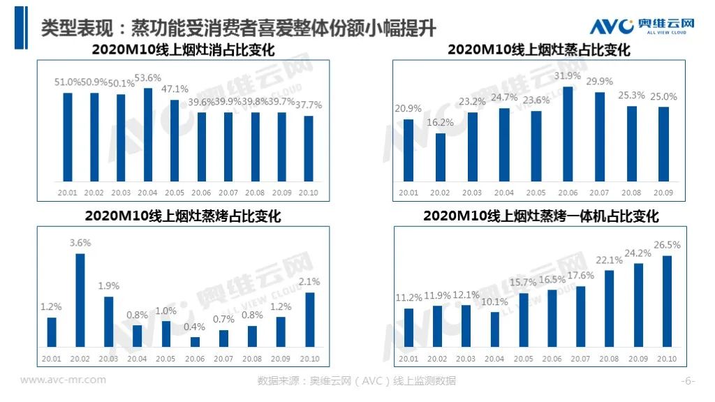 根据奥维云网(AVC)线上监测数据显示,十月集成灶分类型零售额占比烟灶消、烟灶蒸、烟灶蒸烤一体机占比分别为37.7%、24.1%、26.5%。从去年同期烟灶消零售额占比58.8%的“一家独大”到如今的“三足鼎立”,蒸功能的崛起与中国的饮食习惯密不可分。