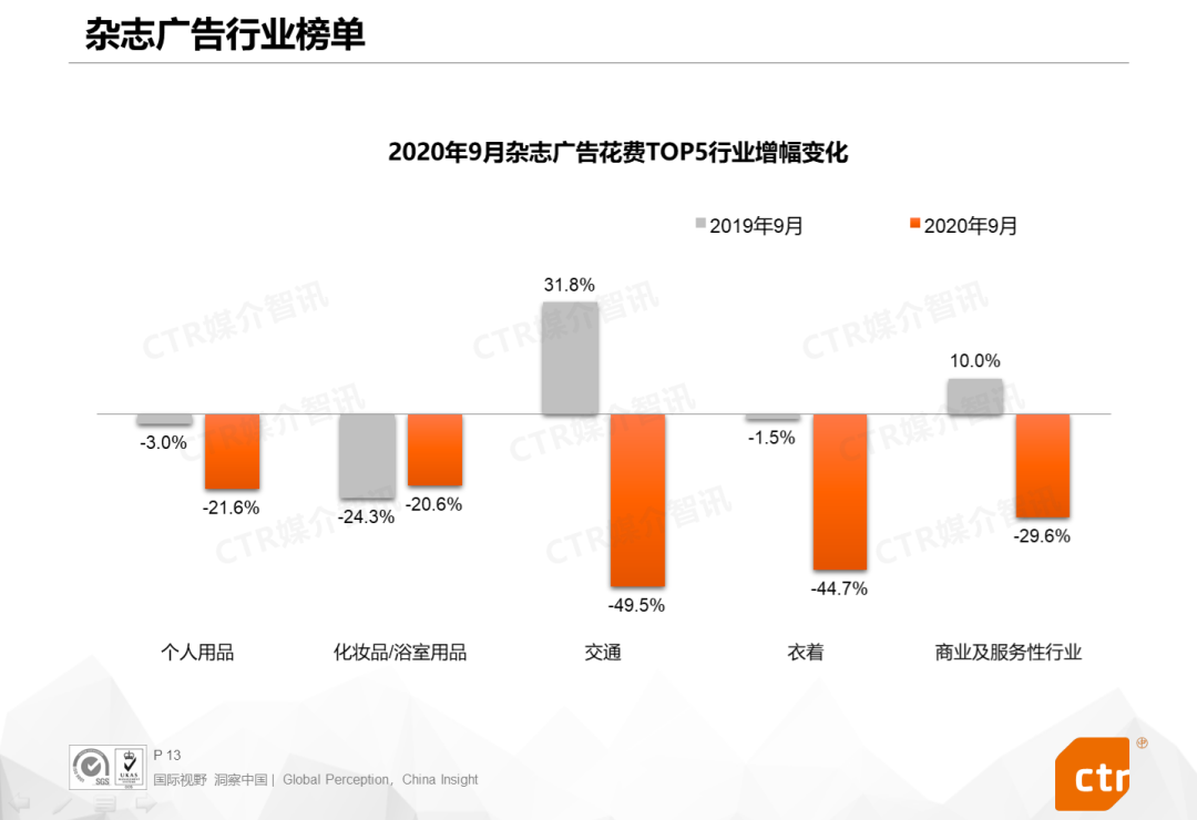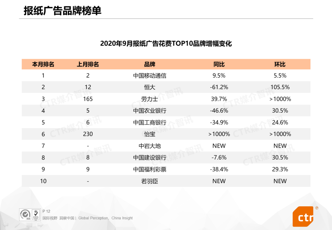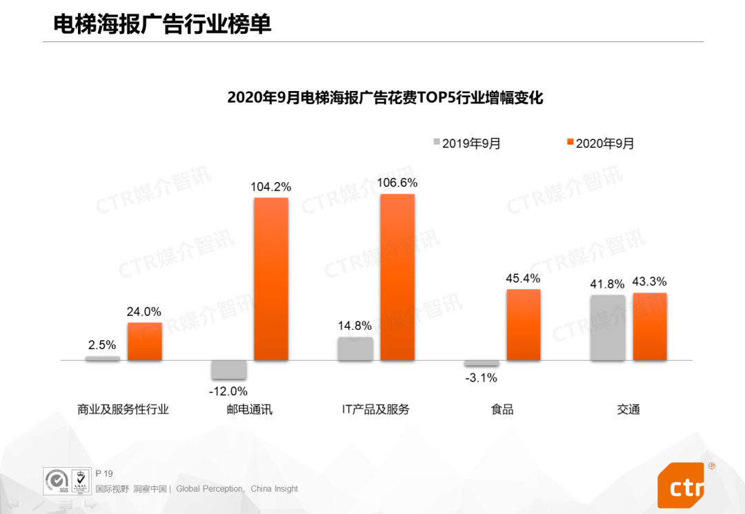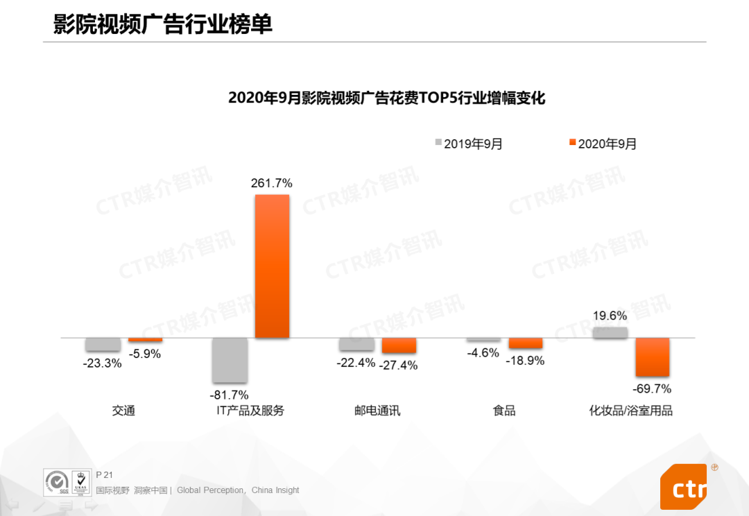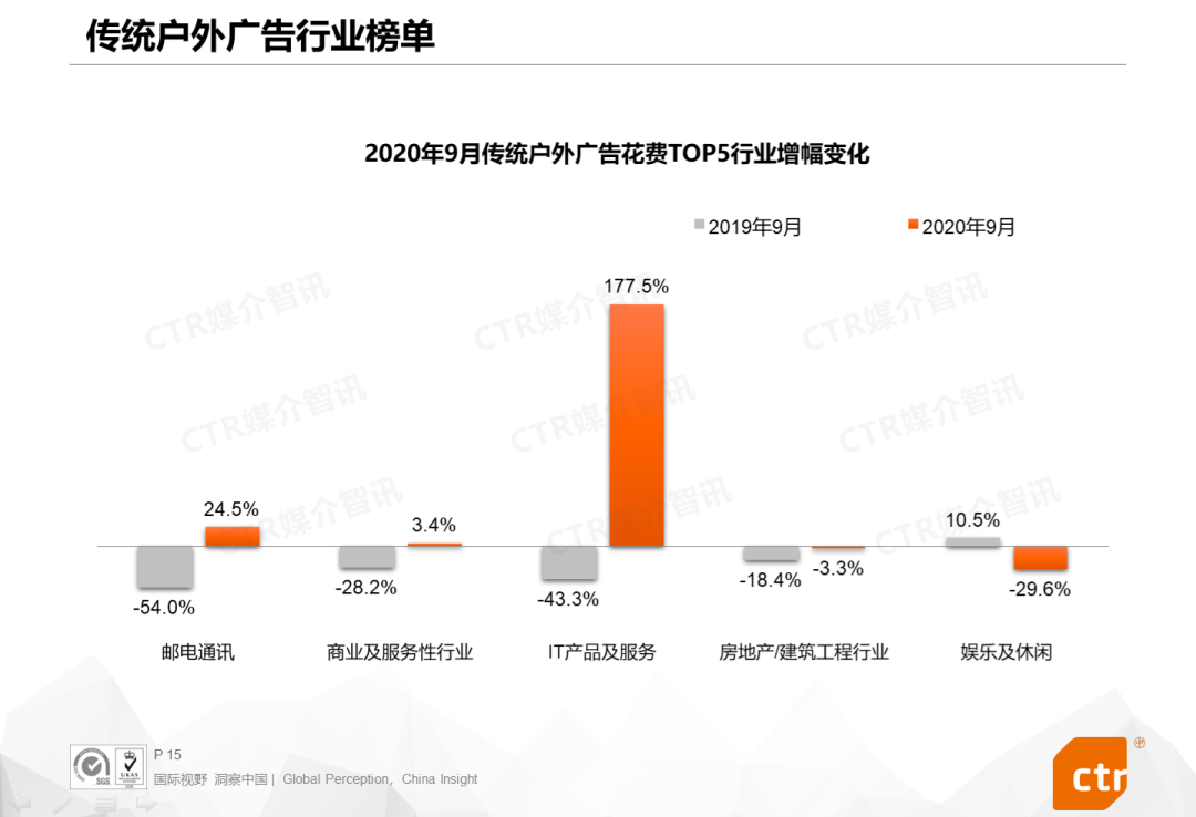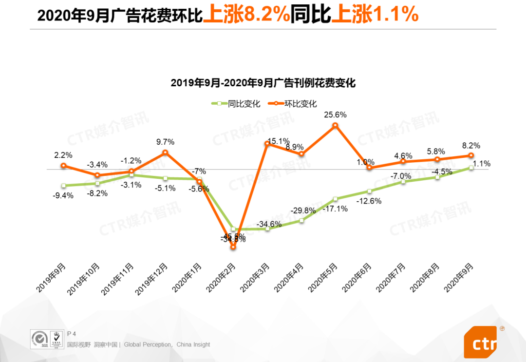 根据CTR媒介智讯的数据显示,2020年9月广告市场花费同比和环比迎来双增长,环比提升8.2%,同比提升1.1%,这也是继去年12月份以来,广告市场首次回归同比正增长。9月各地影院逐步开放,影院视频广告总量增加,相信随着影院排片量的增长,影院广告收入很快会恢复到疫情前水平。同时,疫情对广告市场的影响在逐步减少,电视、报纸、广播、电梯广告的环比持续增长。