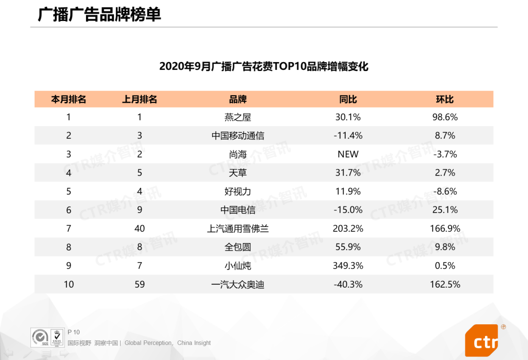 邮电通讯、IT产品及服务都是与互联网相关的两大行业,包含各类网站、App以及电脑或手机通讯等品牌。今年以来,一些在线教育、生活服务、在线问诊等互联网品牌在多个广告渠道投放大量广告,不断提升两个行业的广告花费同比。9月份,传统户外广告榜单中,学而思、VIP KID、斑马AI课、京东金融、好大夫在线等互联网品牌广告花费增长明显,同时,在电梯广告榜单中,学而思旗下的题拍拍、由58到家更名后的天鹅到家、房屋交易软件安居客广告投放量较大。