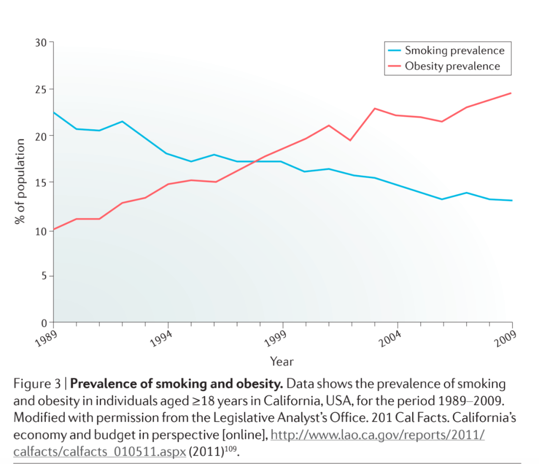 随着“吸烟有害健康”的普及,越来越多的人选择不吸烟。在美国加利佛尼亚,从1989到2009年,吸烟率逐渐下降。但是对于已经吸烟的人来说,戒烟仍然很困难。虽然有大约70%的青少年和成年吸烟者都表示,他们烟瘾很大,想戒烟,但是只有约7%的吸烟者真正的尝试去戒烟。不去尝试戒烟或戒烟不成功除了烟草中的尼古丁让人上瘾之外,担心戒烟后体重增加也是很多人不去戒烟的一个主要原因。