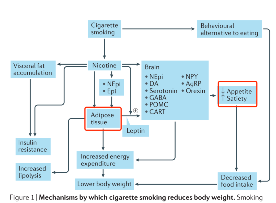 尼古丁除了可以让大脑分泌多巴胺和血清素让人感到快乐和上瘾之外,它还直接影响了身体的新陈代谢,增加了能量消耗。尼古丁可以减少下丘脑中的食欲信号,起到抑制食欲作用,导致食物摄入减少;尼古丁可以增加棕色脂肪组织的产热能力,使棕色脂肪组织中UCP1和UCP3的表达量增加。(大量的研究表明棕色脂肪组织不仅具有御寒功能,而且还会燃烧多余脂肪和糖分,产生热量,防止体内储存过多的脂肪);尼古丁激活了交感神经系统,使肾上腺素和去甲肾上腺素水平增加 。