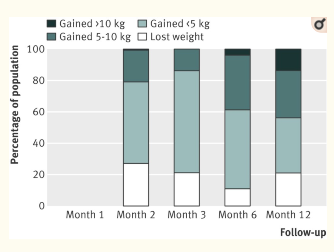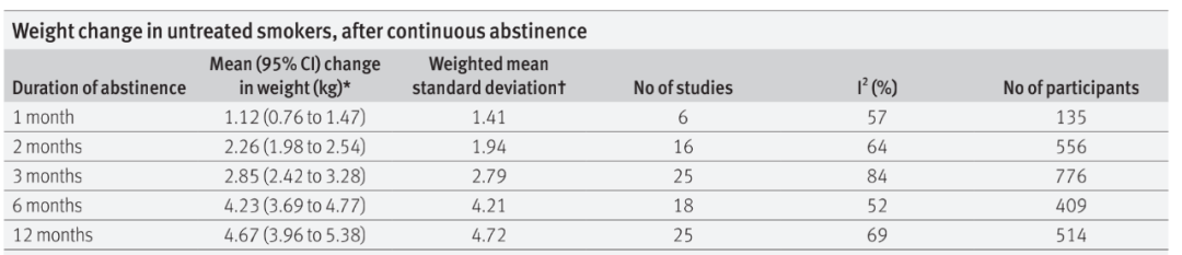 发表在《英国医学杂志》(The BMJ)上的一项研究显示,对于戒烟12个月的参与者来说,平均而言,第一个月体重增加了1.1公斤,第二个月体重增加了2.3公斤,然后体重持续增长,一直到4.7公斤。其中有13%的人戒烟后体重增加了10公斤以上。