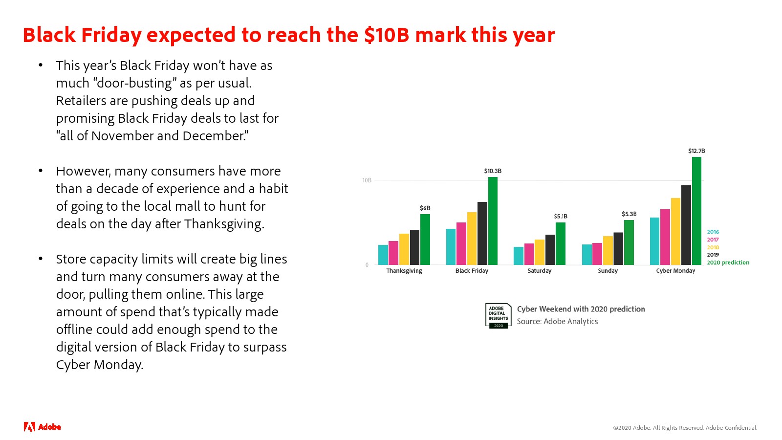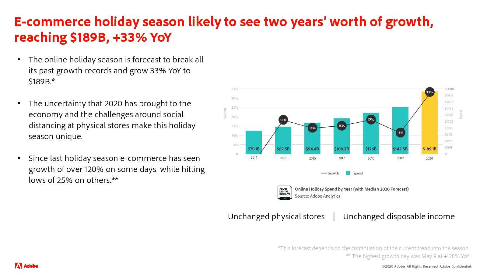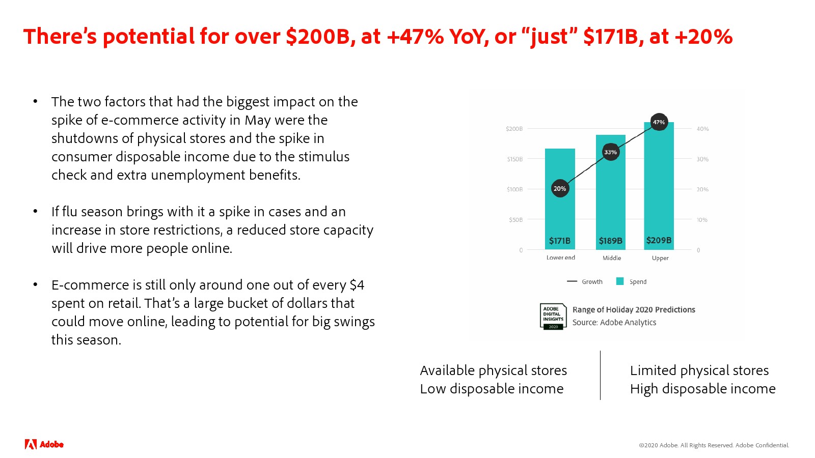 Adobe预测,在线假期支出将达到1,890亿美元,同比增长33%。如果流感季节使人们无法购物,那么在线消费的潜力可能会更高,达到2000亿美元(同比增长47%)。