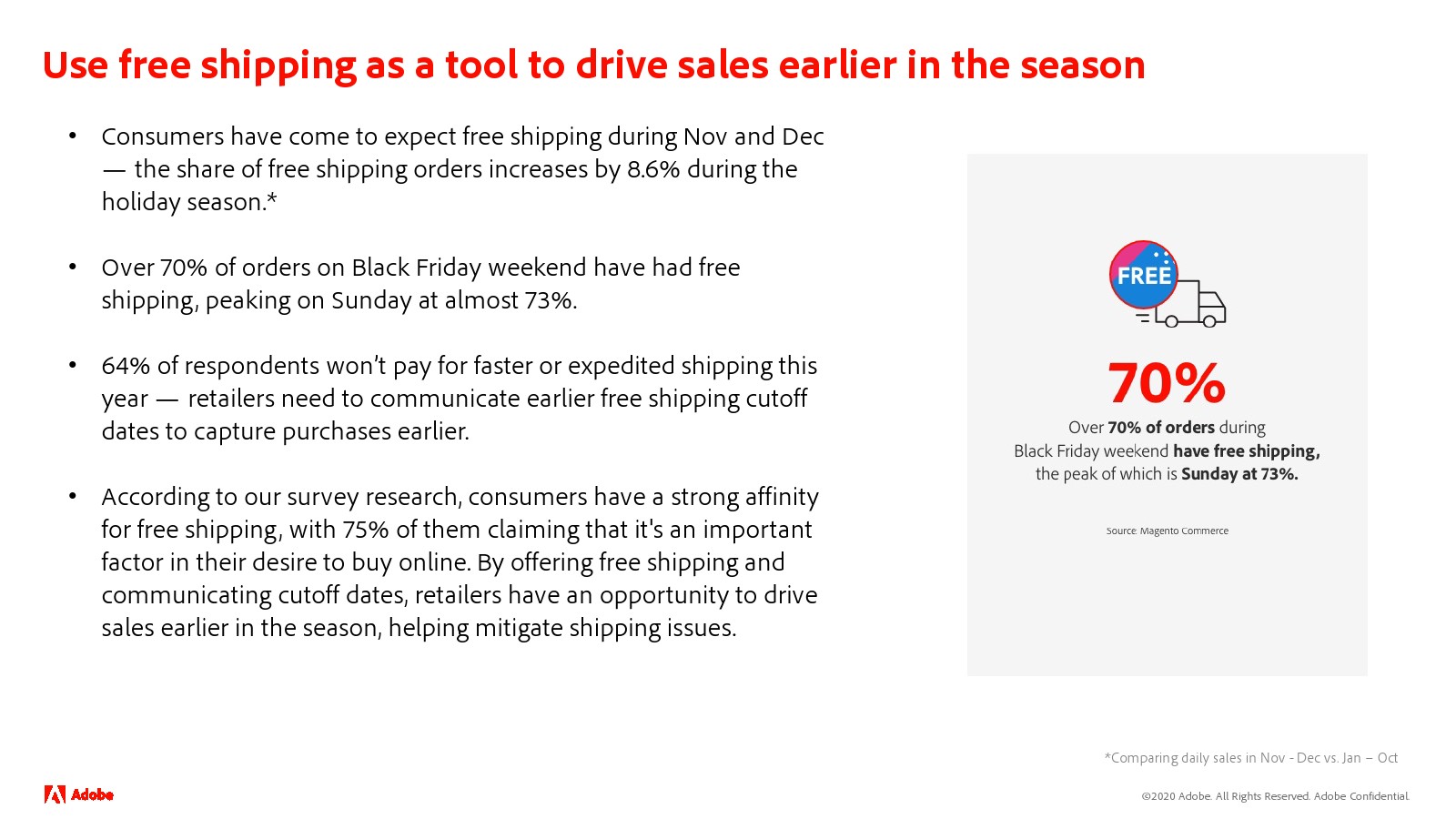 大多数消费者不愿意为加快运输速度而付费(64%),这很可能是因为他们期望在11月和12月期间能够免邮费。75%的受访者认为免邮费是在线购物的重要考虑因素。在节日期间,免运费订单的份额通常会增长8.6%。