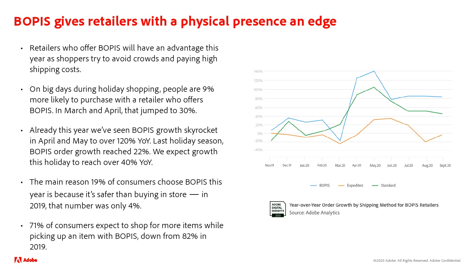 提供在线购物并选择店内提货的选项(BOPIS)的零售商赢得了2019年网络周,并将在2020年假日购物季继续受益。今年4月至5月大流行首次爆发时,BOPIS订单同比增长了120%。