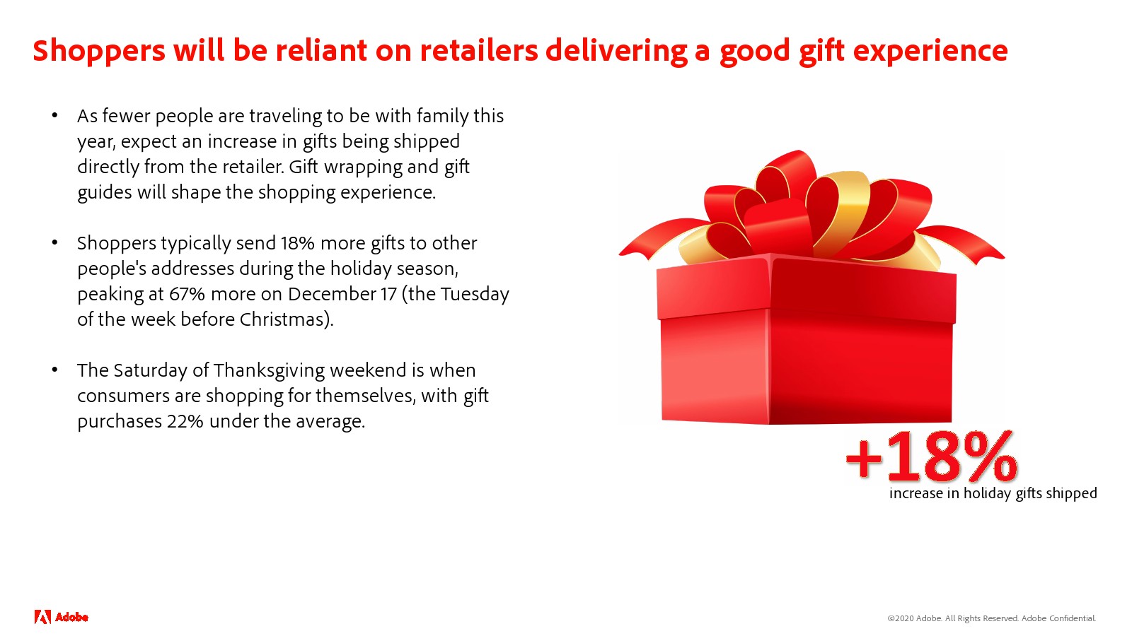 预计今年发货的礼物也将增加18%,礼品包装选项和礼物指南将改变购物体验。