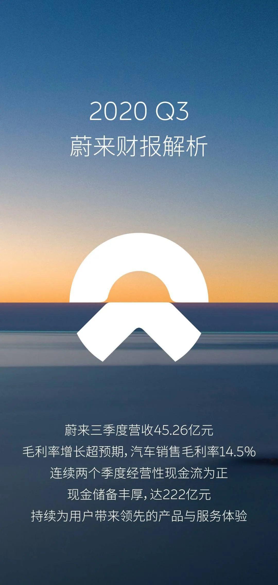 2020年11月18日,蔚来于周二美股盘后发布2020 年第三季度财报。数据显示,蔚来三季度总营收达45.26亿元,汽车销售毛利率14.5%,综合毛利率12.9%。单车销售及综合管理费用同比下降68.2%,体系化效率显著提升。