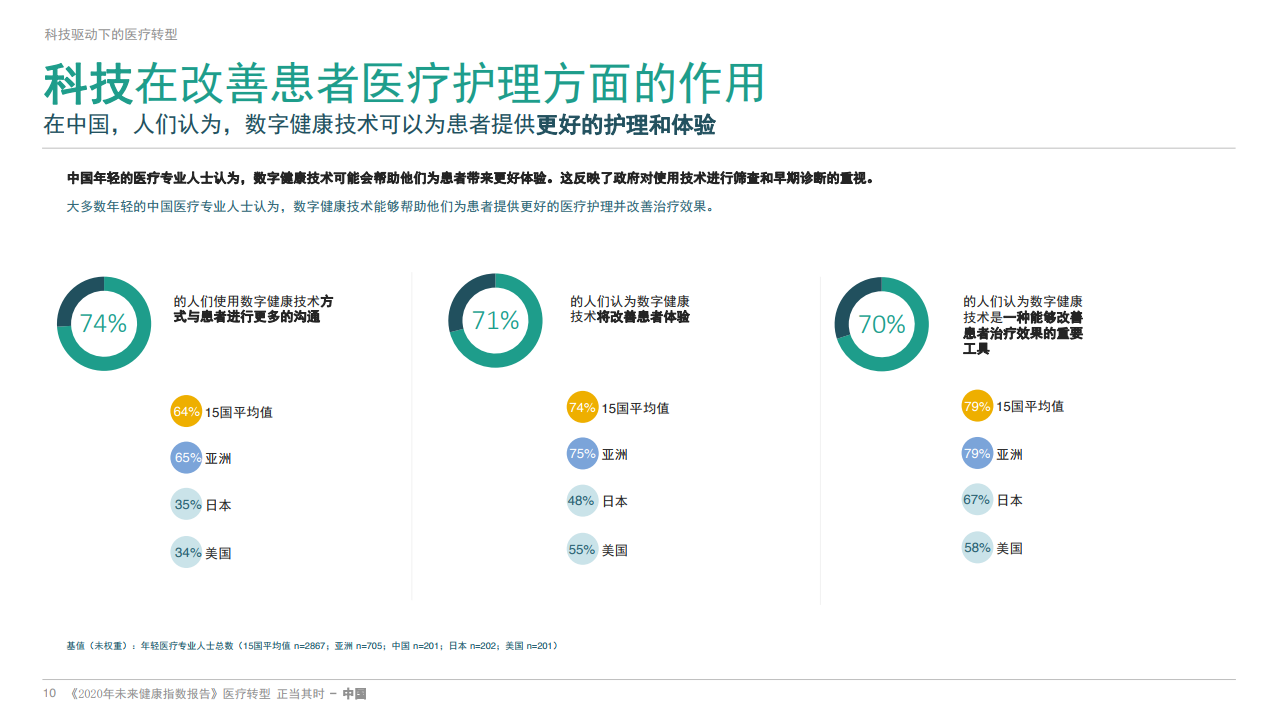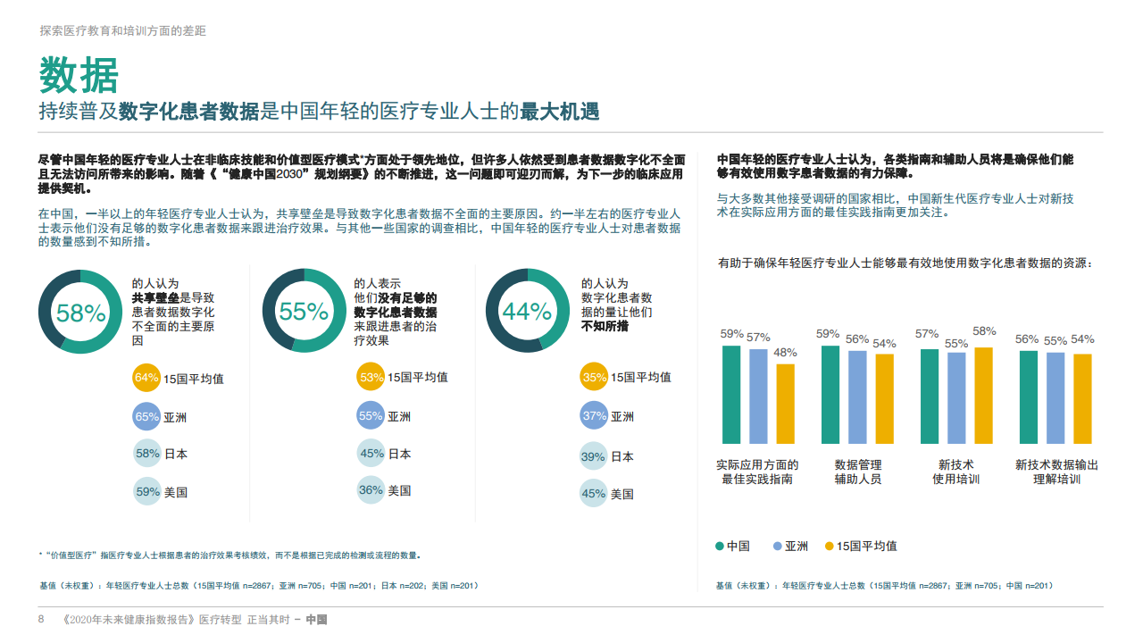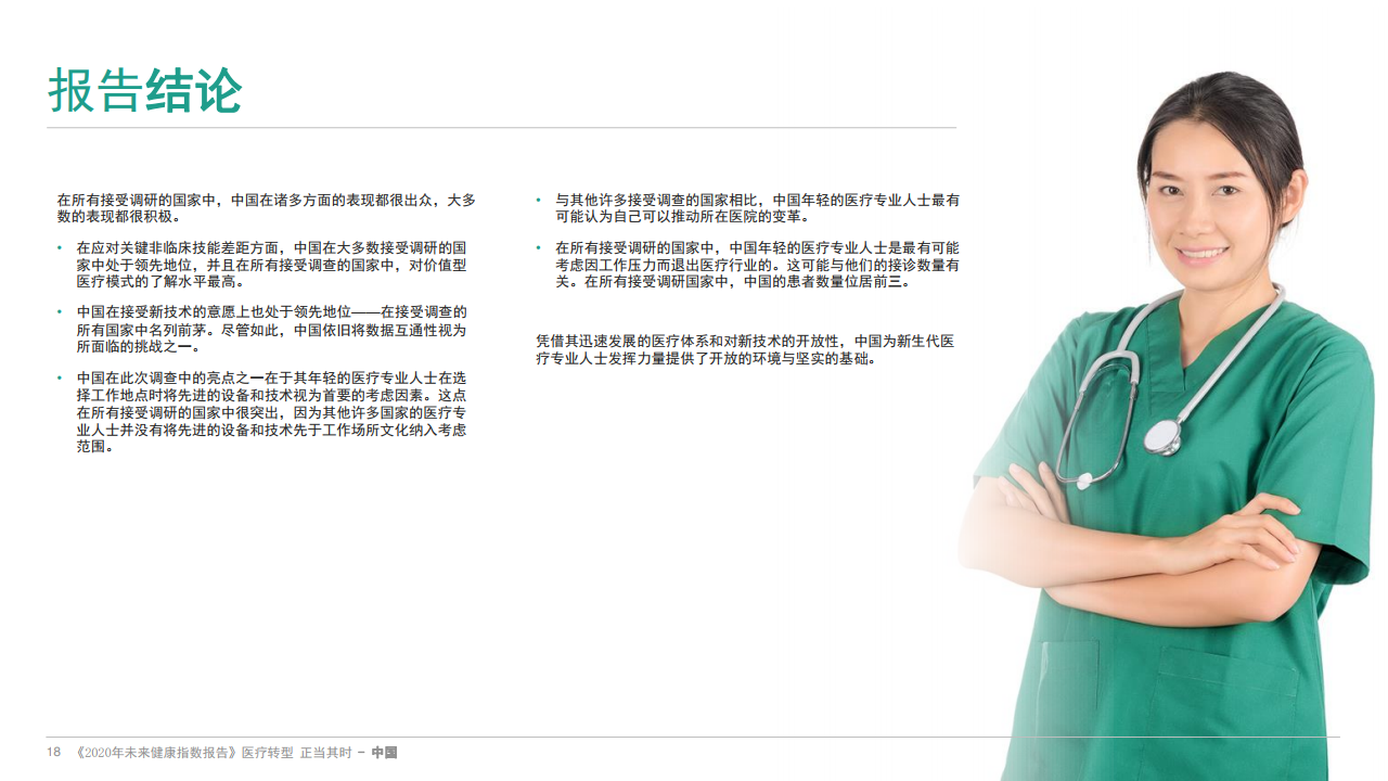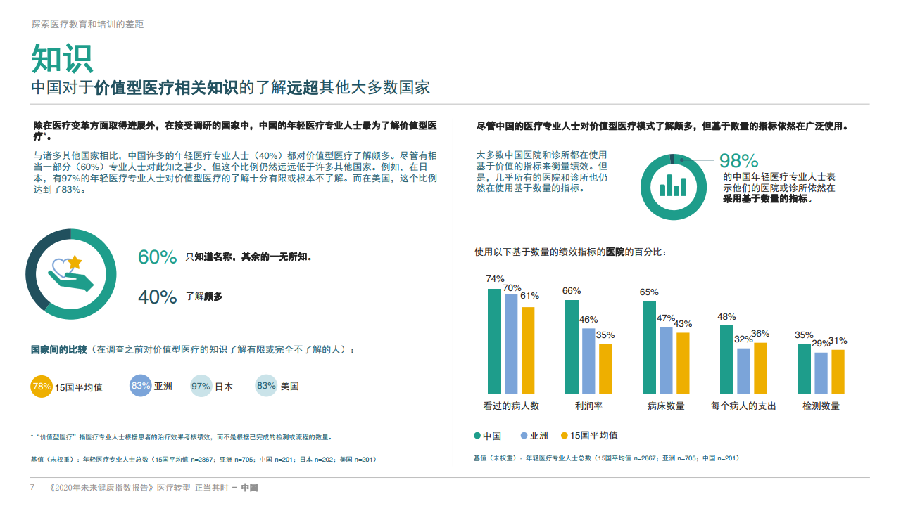 “2020年未来健康指数报告” 指出,在接受调研的国家中,40% 的中国年轻医疗专业人士对“价值型”医疗模式十分了解,这个比例远远高于许多其他国家。这也意味着,中国年轻医疗专业人士更能推动向 “以患者为中心”的医疗服务的转变。