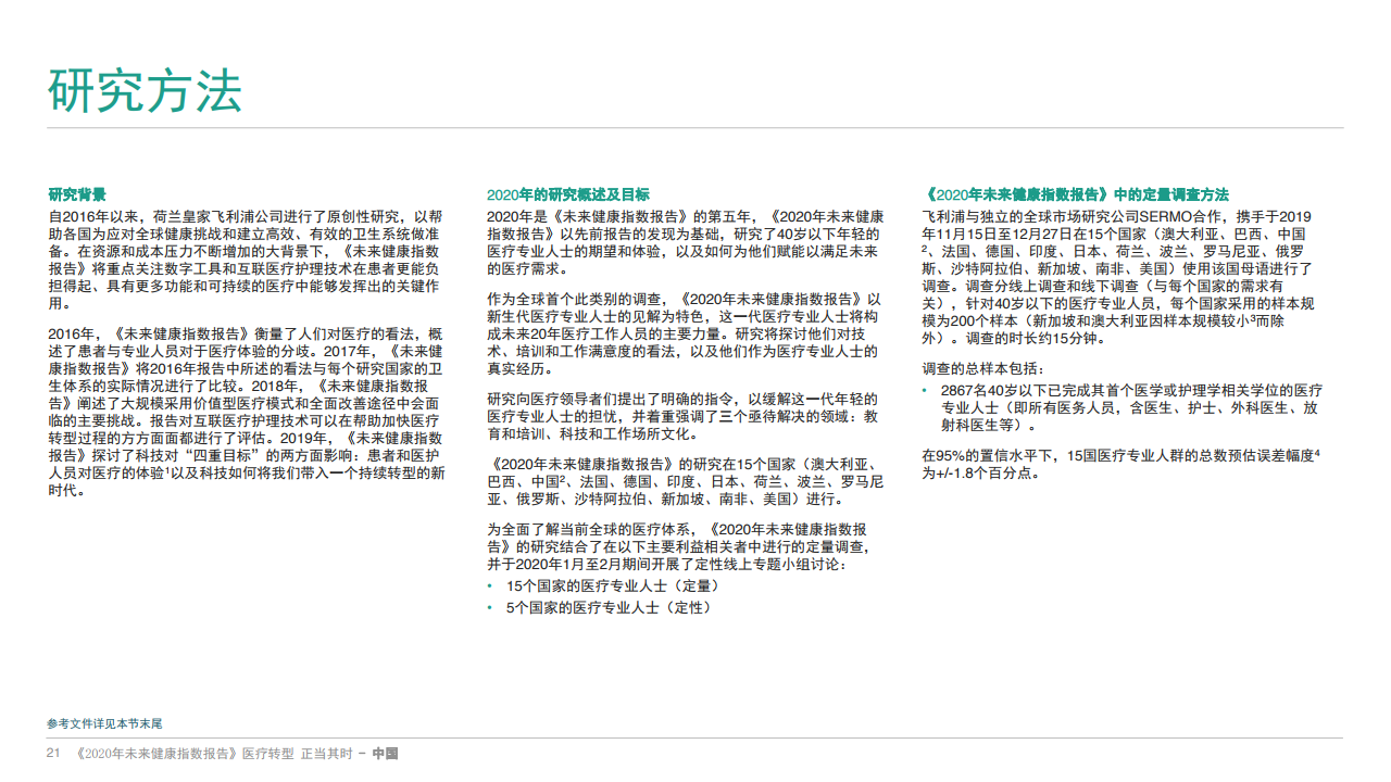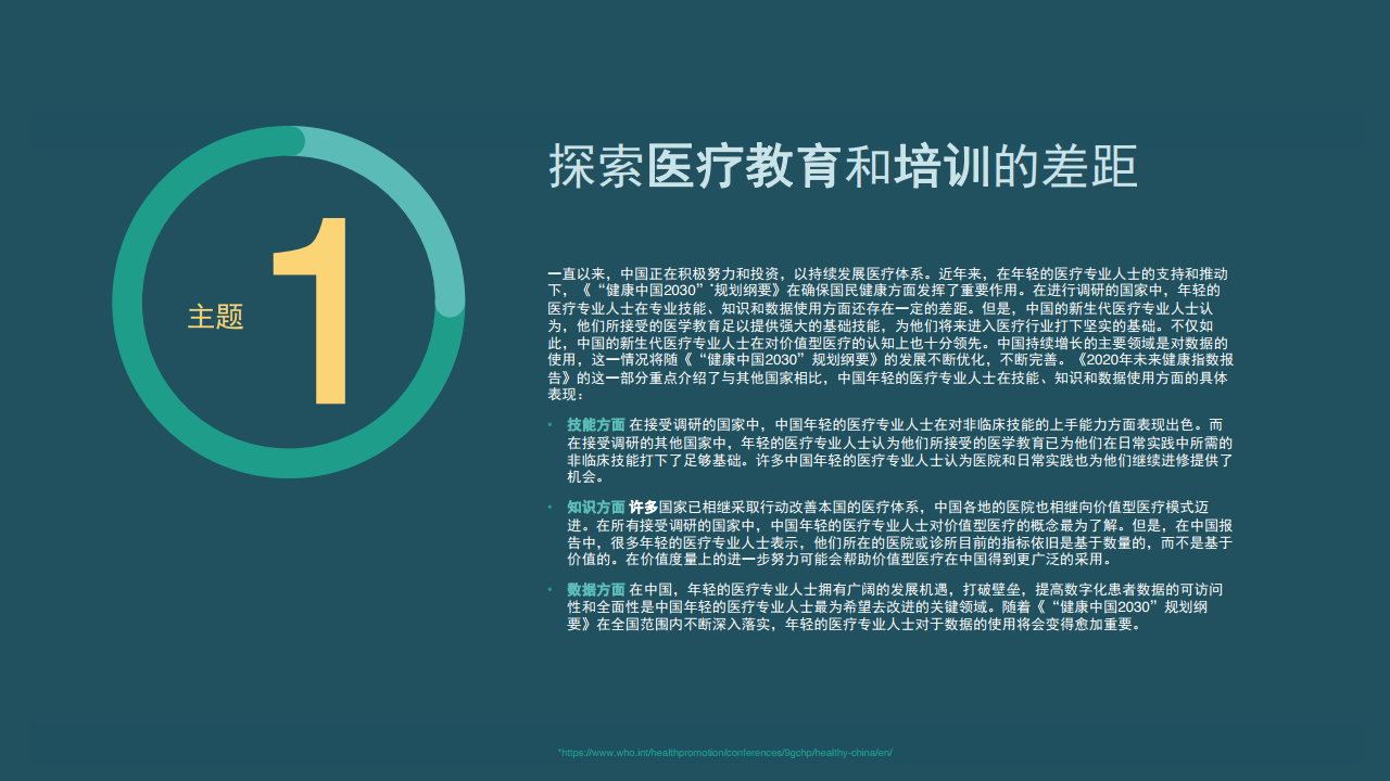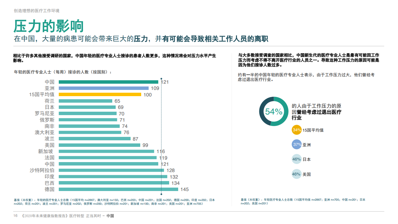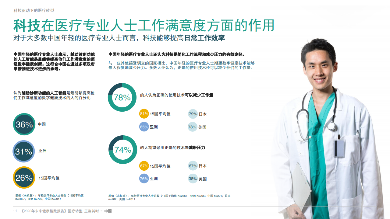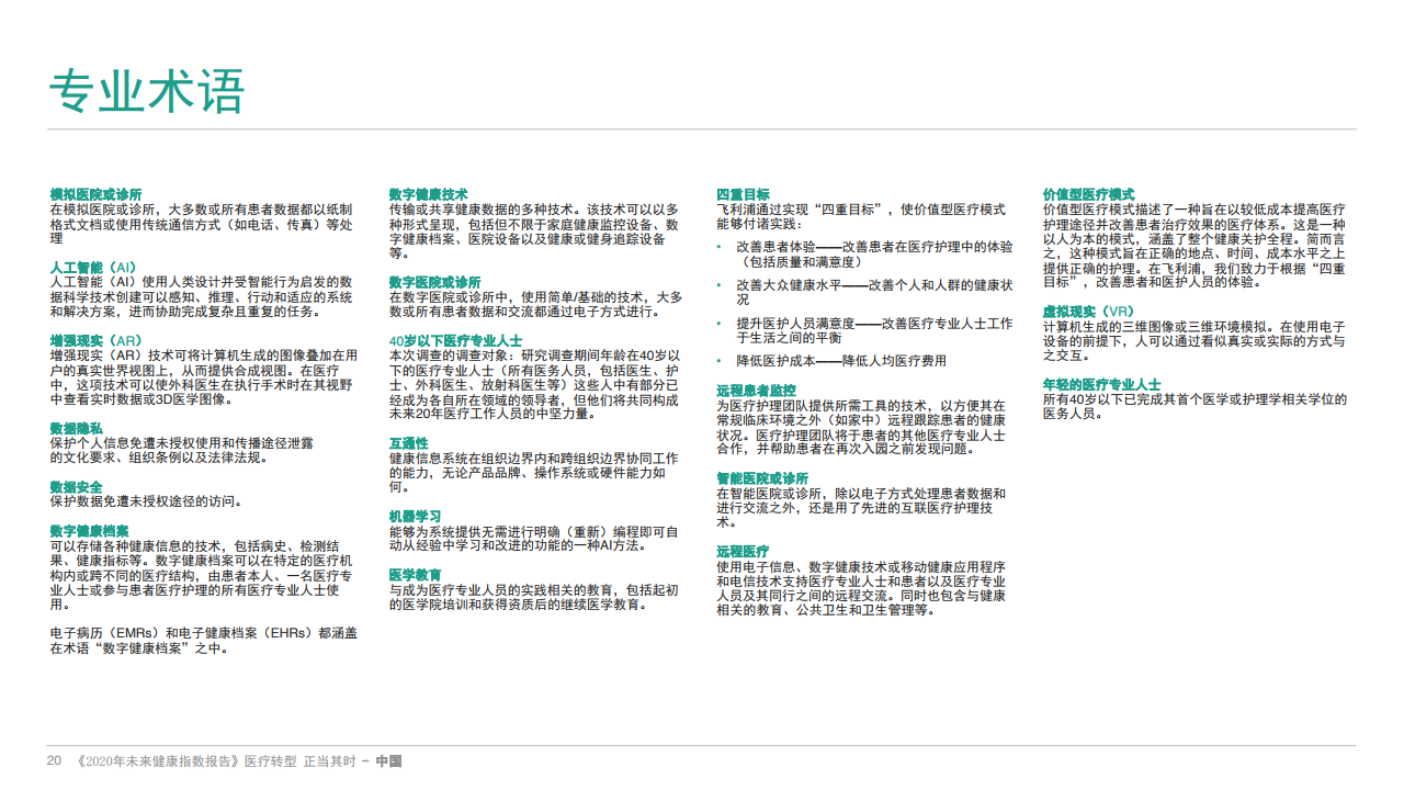 “2020年未来健康指数报告” 指出,在接受调研的国家中,40% 的中国年轻医疗专业人士对“价值型”医疗模式十分了解,这个比例远远高于许多其他国家。这也意味着,中国年轻医疗专业人士更能推动向 “以患者为中心”的医疗服务的转变。