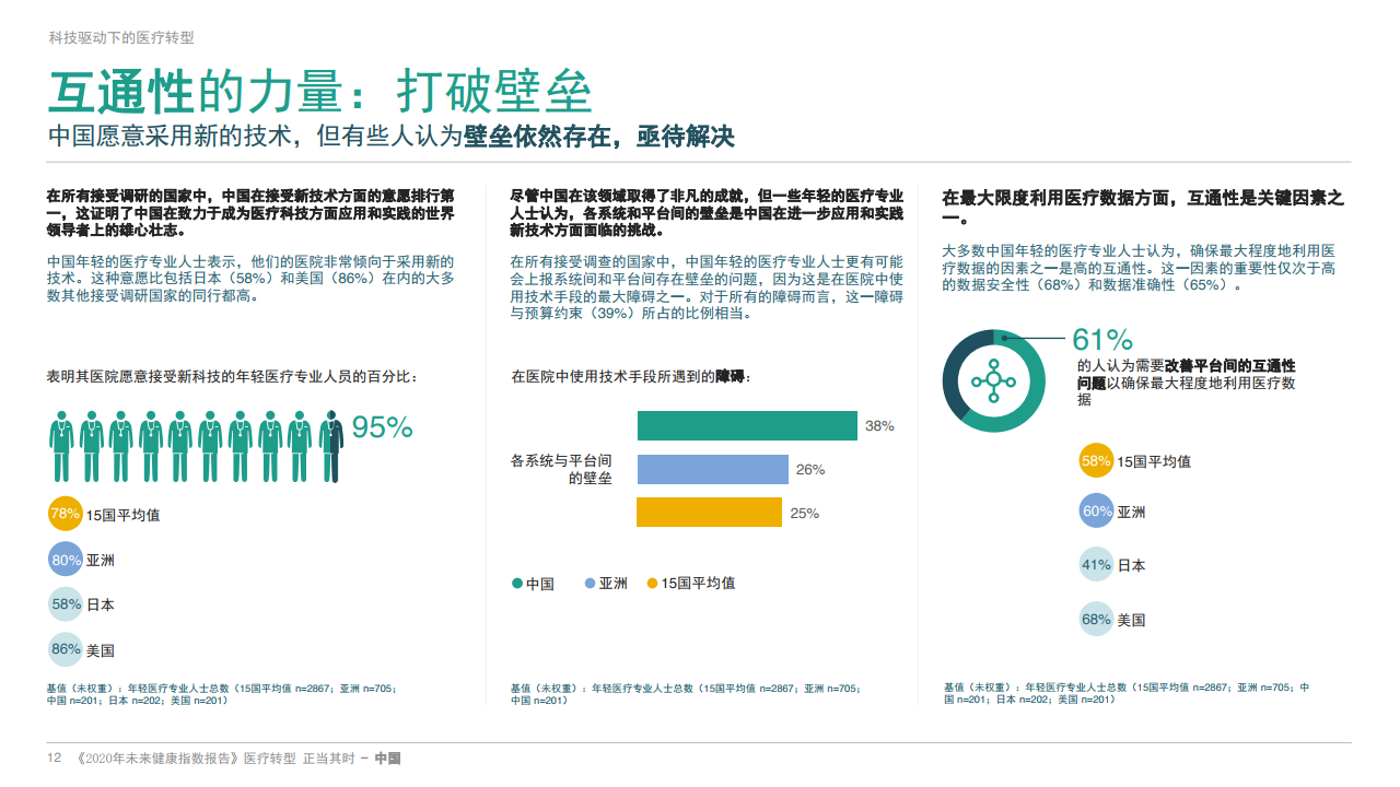 在更加向往新技术的同时,部分中国年轻医疗专业人士也感到,打破各个平台间的壁垒是中国在进一步应用和实践新技术方面面临的挑战。61% 的中国年轻医疗专业人士认为,平台之间的高互通性是确保最大程度地利用医疗健康数据的重要因素。