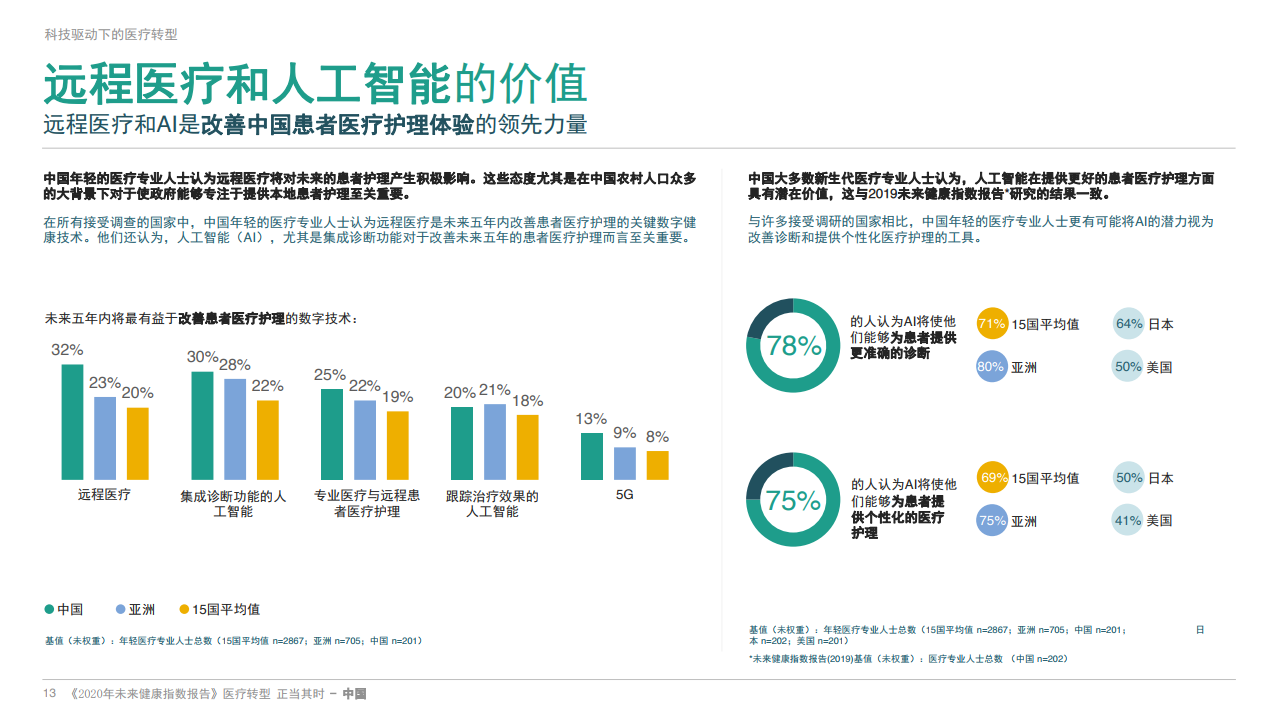 报告显示,相比于大多数其他国家的同行,更多中国年轻的医疗专业人士认为:远程医疗是未来五年内改善患者医疗护理的关键数字健康技术,能够为患者提供更好的医疗护理并改善治疗效果;36% 的中国年轻医疗专业人士认为,辅助诊断功能的人工智能是最能够提高他们工作满意度的顶级数字健康创新,这一比例明显高于其他接受调查国家的(26%)。