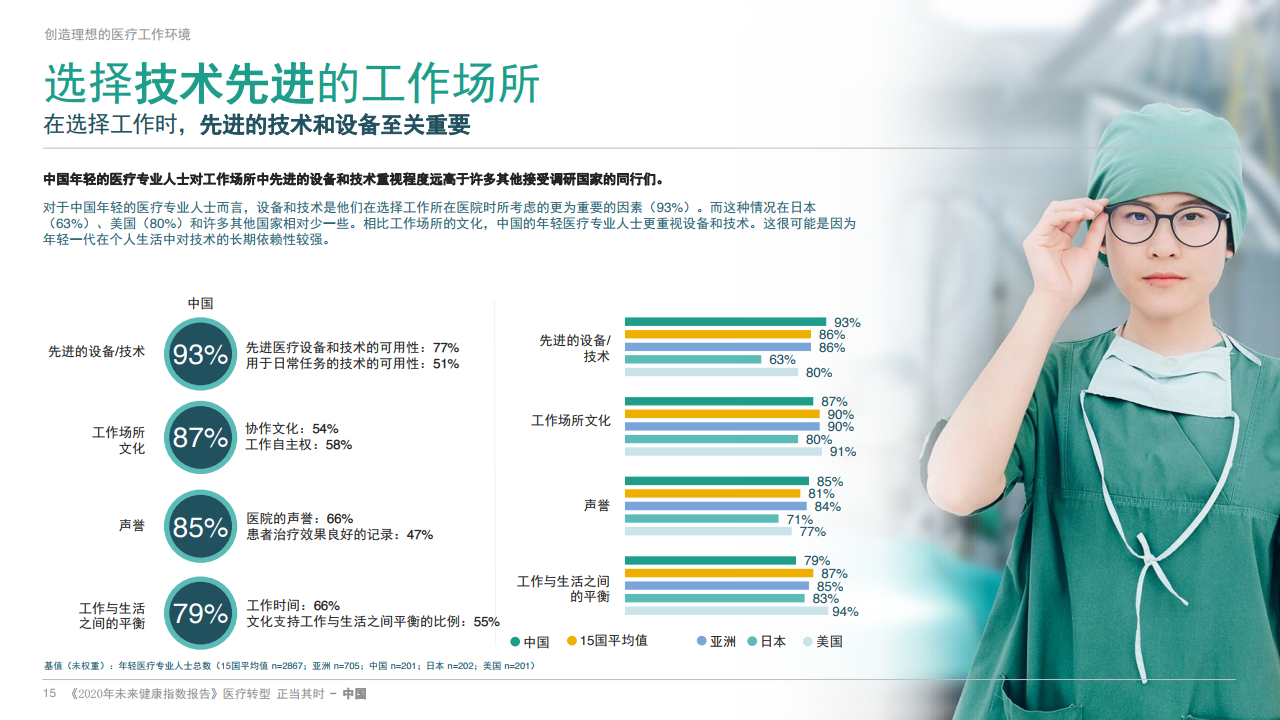 对于中国年轻的医疗专业人士而言,相比工作场所的文化 (87%),设备和技术是他们在选择工作所在医院或诊所时所考虑的更为重要的因素(93%)。相较于接受调研的别国同行,他们认为新技术的应用比工作场所文化更为重要。这种情况即使在其他对技术重要性有高度评价的受访国家中也较为罕见。