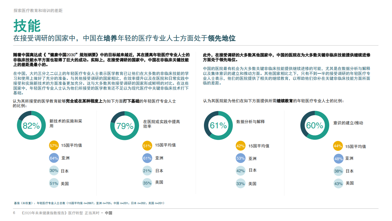 医疗行业正在发生深刻的变革。对于医生来说,除了临床技能外,商务、金融、行政管理、数据分析等非临床技能已经成为医生职业发展中不可或缺的知识和技能。调查显示:中国年轻医疗专业人士在非临床技能方面的能力完备,82% 的中国年轻医疗专业人士表示医学教育已让他们为大多数的非临床技能的学习和使用做足了准备,而在其他接受调查的国家中,这个比例只有57%。