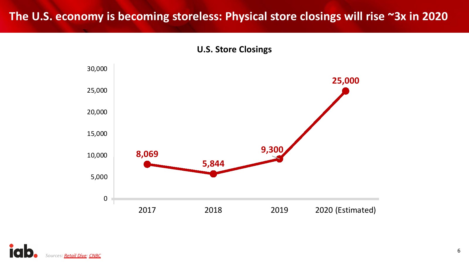 - 美国实体商店的关闭量今年有望突破25,000家,接近去年关闭量的3倍。破产的商店包括布鲁克斯兄弟(Brooks Brothers),克鲁(J.Crew),彭尼(J.C. Penney),洛德&泰勒(Lie&Taylor)、尼曼·马库斯(Nieman Marcus)、Pier 1和Sur La Table。