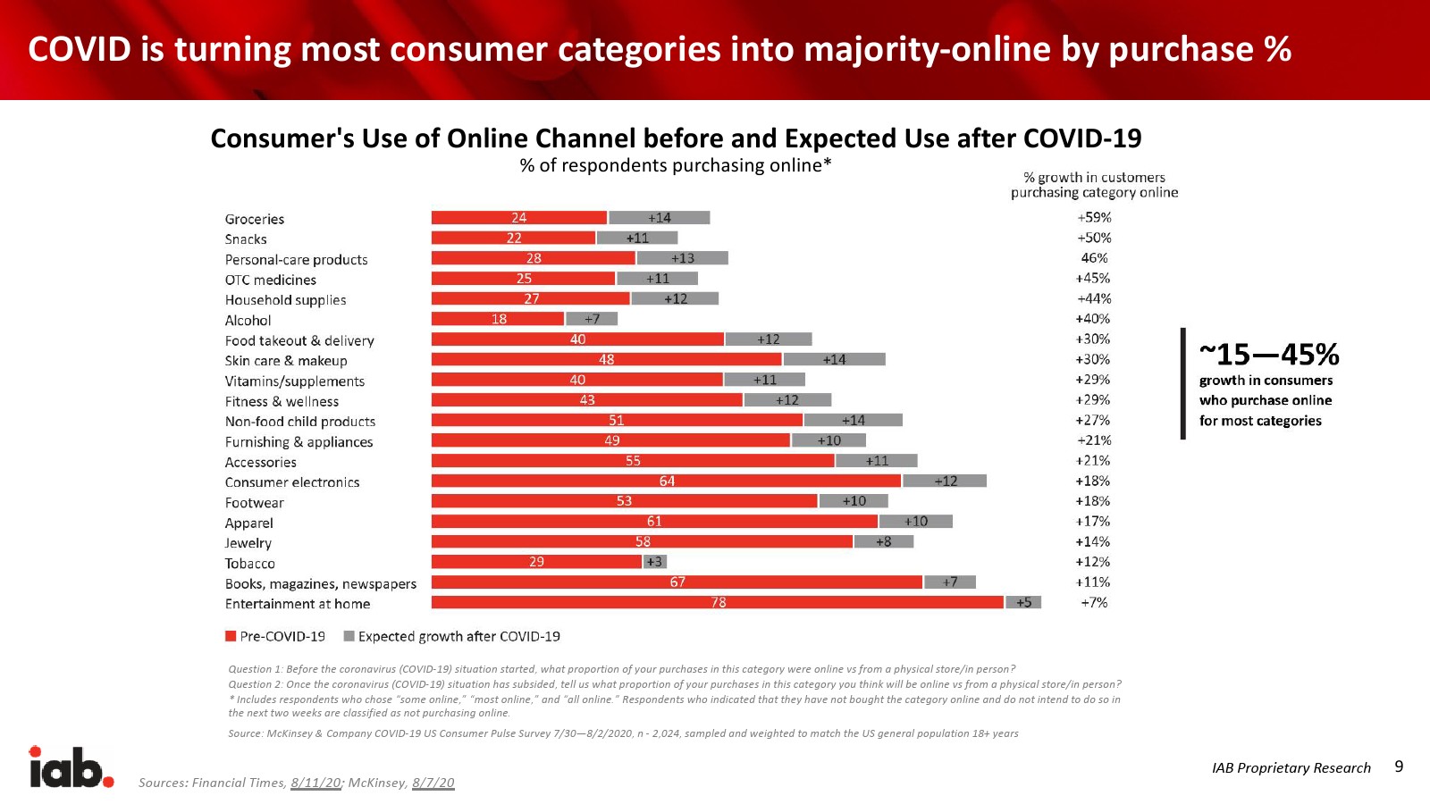 - 现在,大多数的消费品和服务都是“以数字化为主”,与通过实体商店购物相比,通过电子商务进行购物的消费者更多。麦肯锡(McKinsey)的研究预测,几乎每个消费类别的永久在线购物量都将增长15-45%。