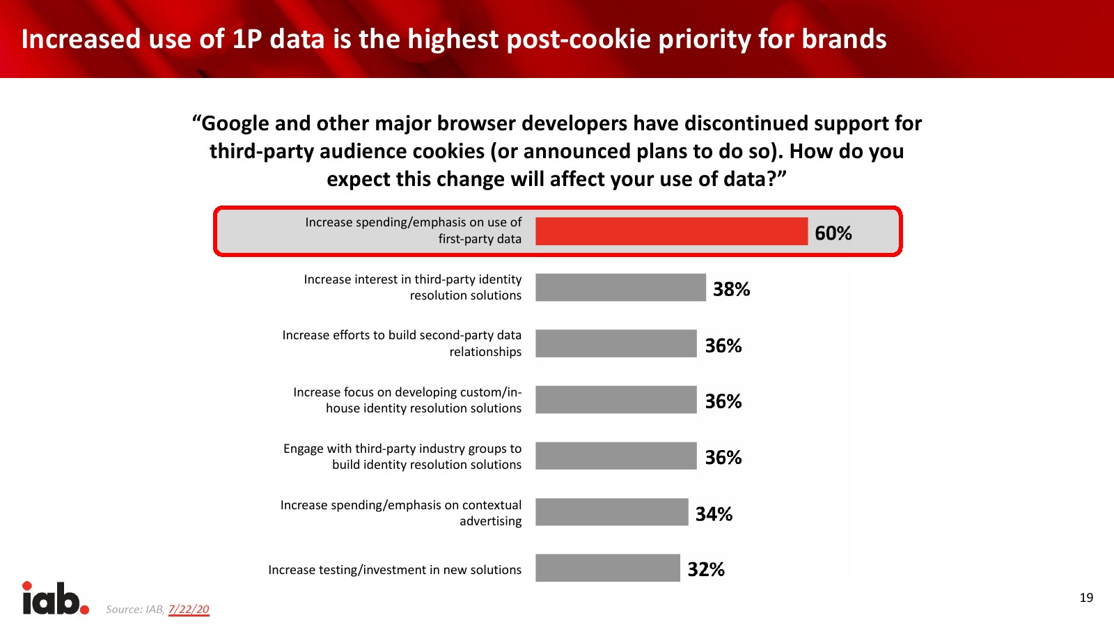 - “无存储”与政府隐私法规以及浏览器/操作系统数据限制的结合,正在促使60%的营销人员对第一方数据进行投资。