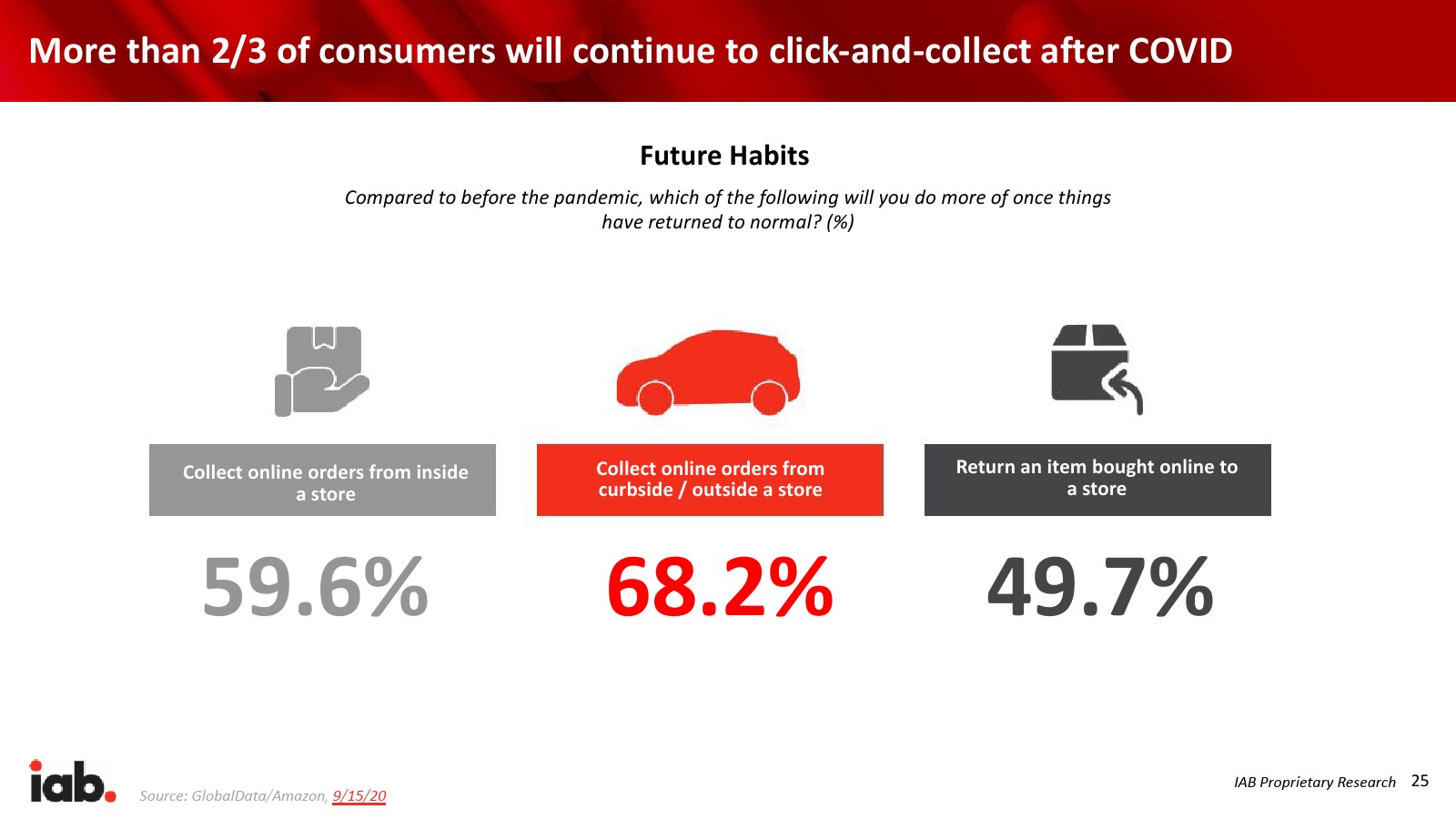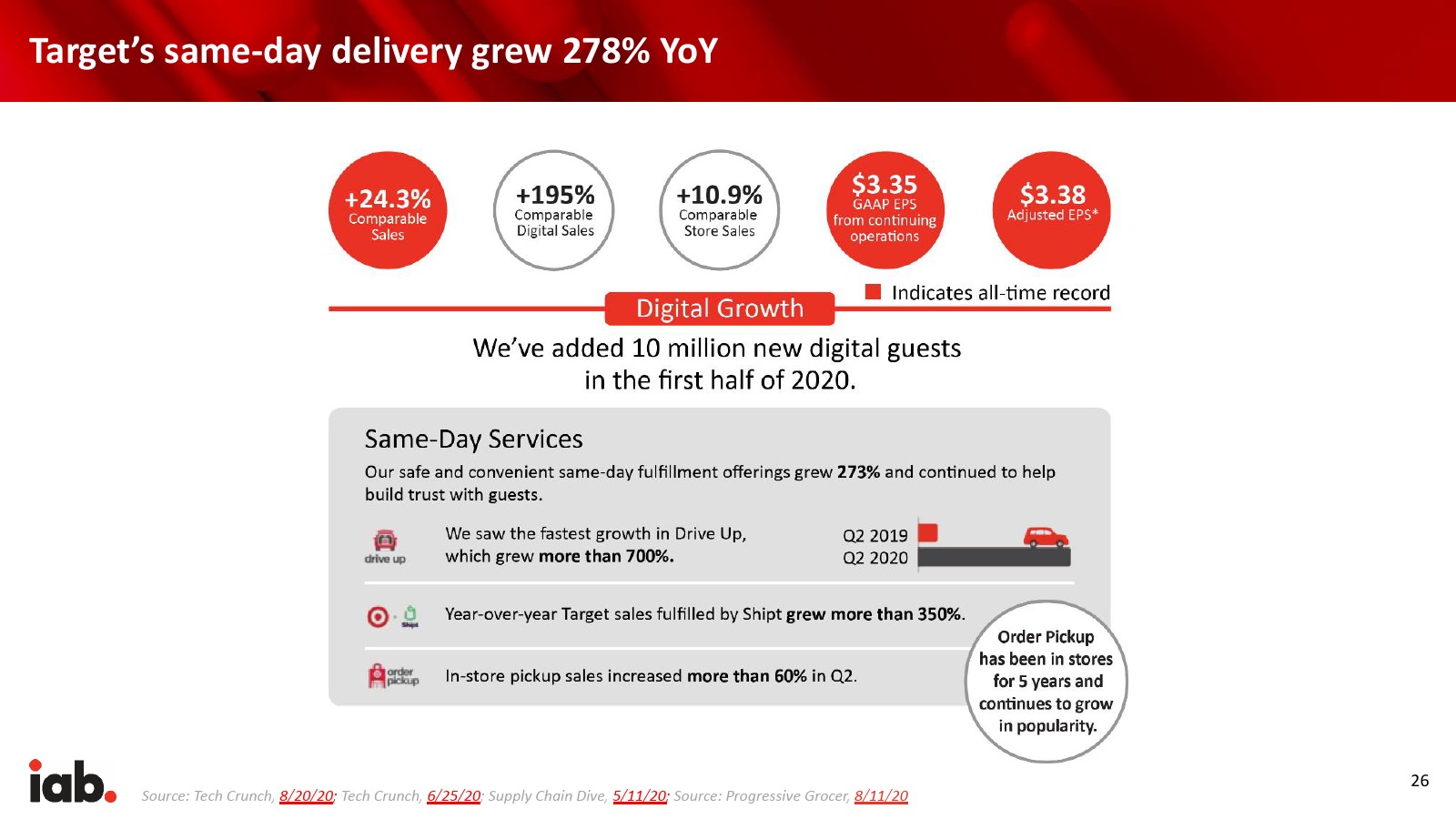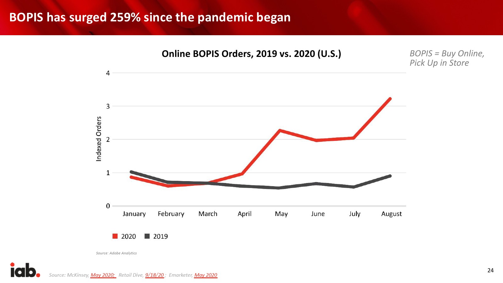 - 在COVID期间,Target的当天交付量增长了350%,而Target的BOPIS(在线购买,商店取货)增长了700%。目前,美国500强零售商中有43%提供BOPIS,高于去年12月的7%。