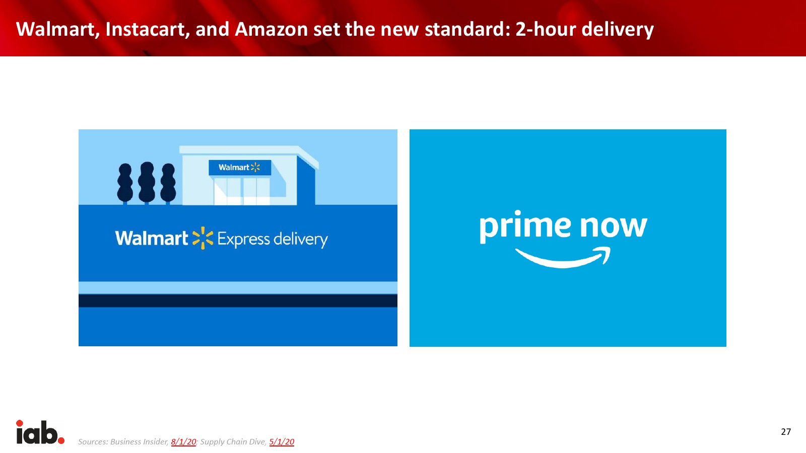 - 沃尔玛(Walmart)和亚马逊(Amazon)的竞争使两个小时交货成为主要的市场标准。对于所有品牌来说,快速实现交付的伙伴关系至关重要。