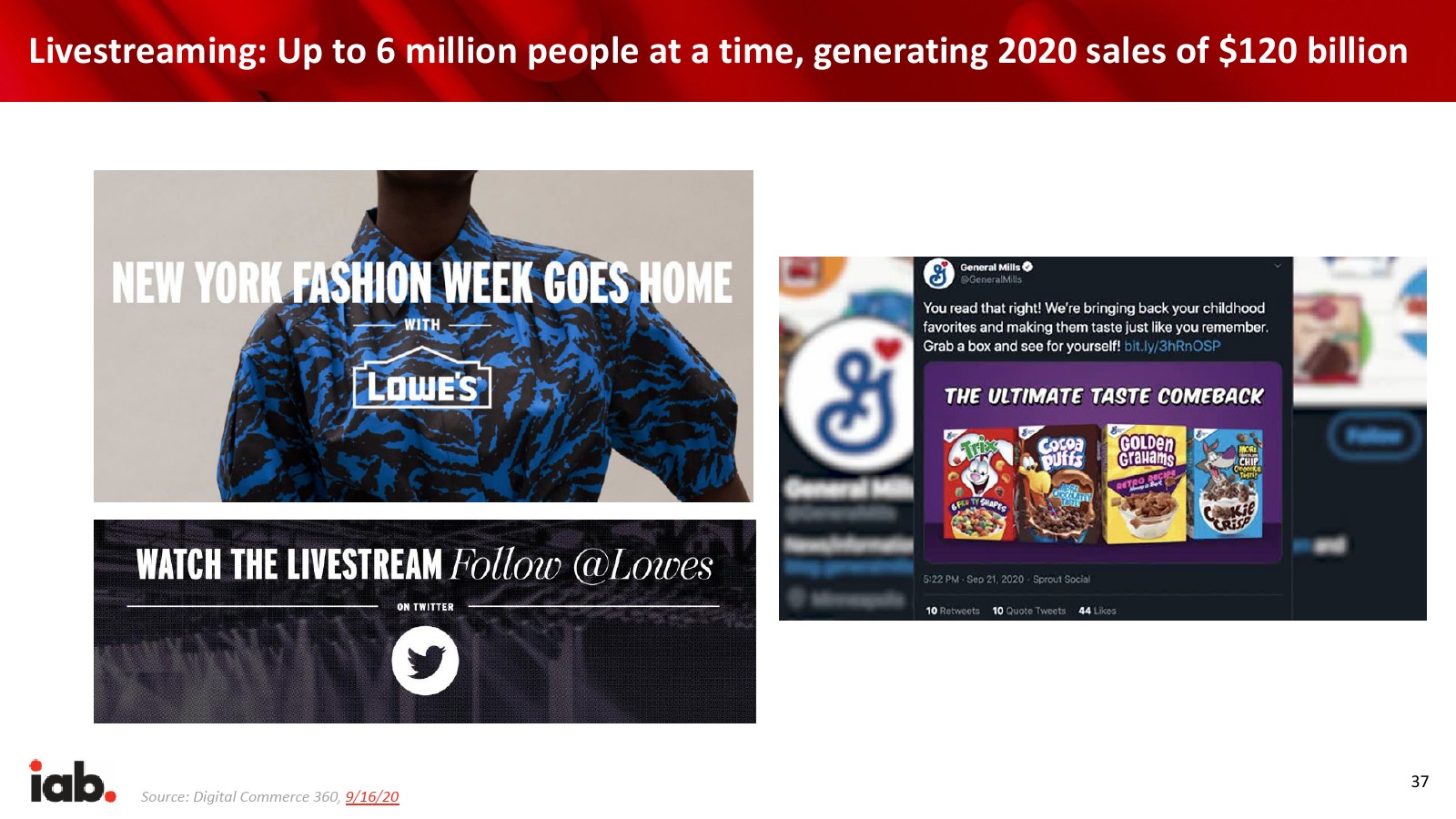 - 今年,全球直播产生的销售额预计将翻一番,达到1200亿美元。在中国,2019年双十一就创造了29亿美元的销售额。