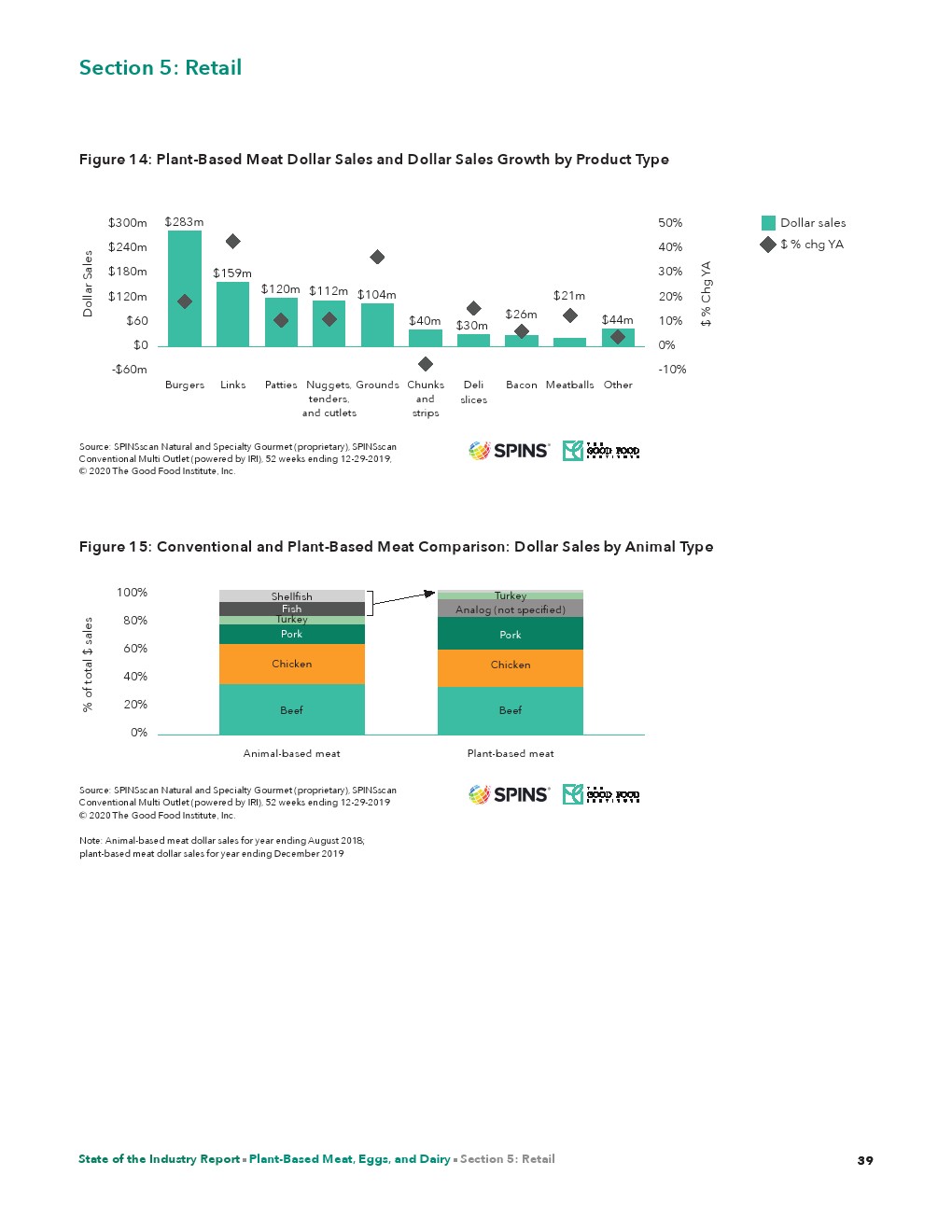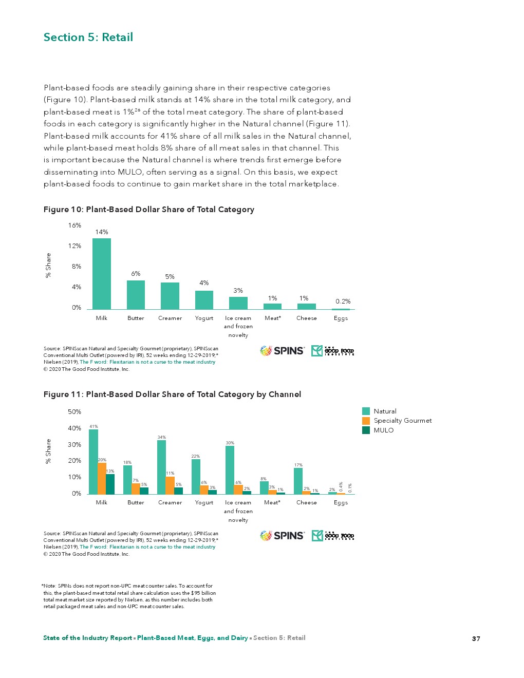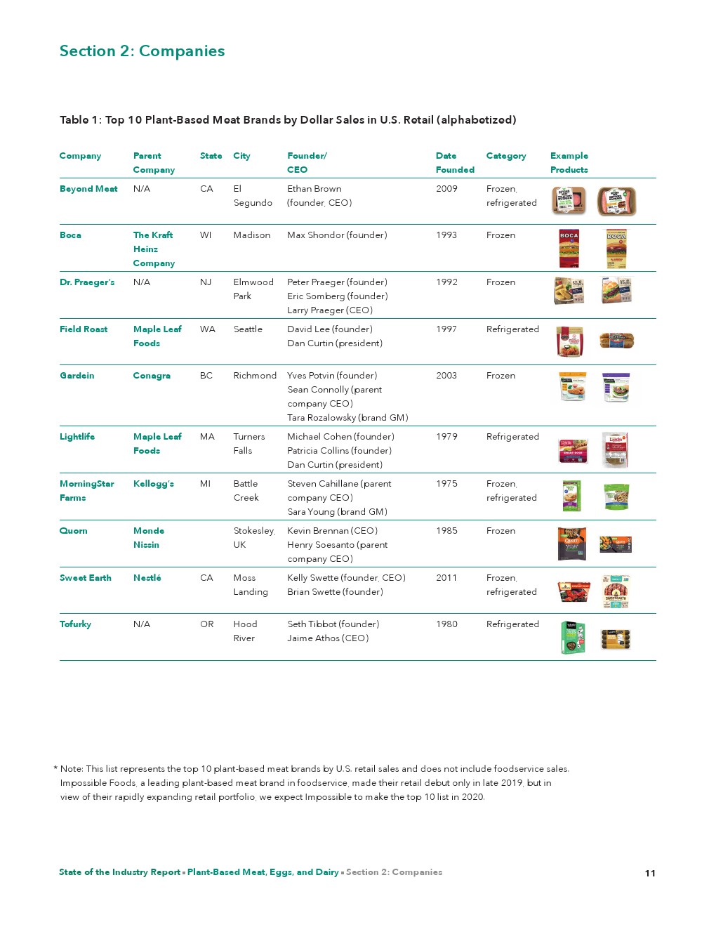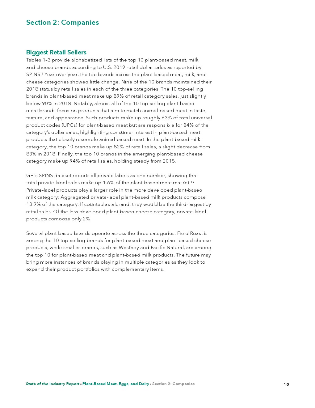报告评价了2019年美国零售销售额排名前10位的植物性肉、牛奶和奶酪品牌。与去年同期相比,植物性肉类、牛奶和奶酪类别变化不大。前10个品牌中有9个在三个类别中都保持了其2018年零售地位。植物肉类的10个最畅销品牌占零售销售额的89%,在2018年略低于90%。值得注意的是,几乎10个植物性肉类最畅销品牌都专注于匹配产品的动物性肉的味道、质地和外观。这些产品约占植物性肉类通用产品(UPC)的63%,但占该类别销售额的84%,这凸显了消费者对与动物性肉类非常相似的植物性肉类产品的兴趣。