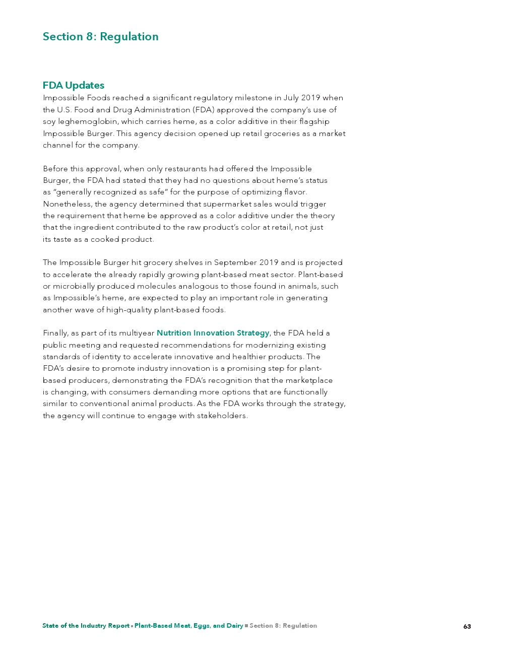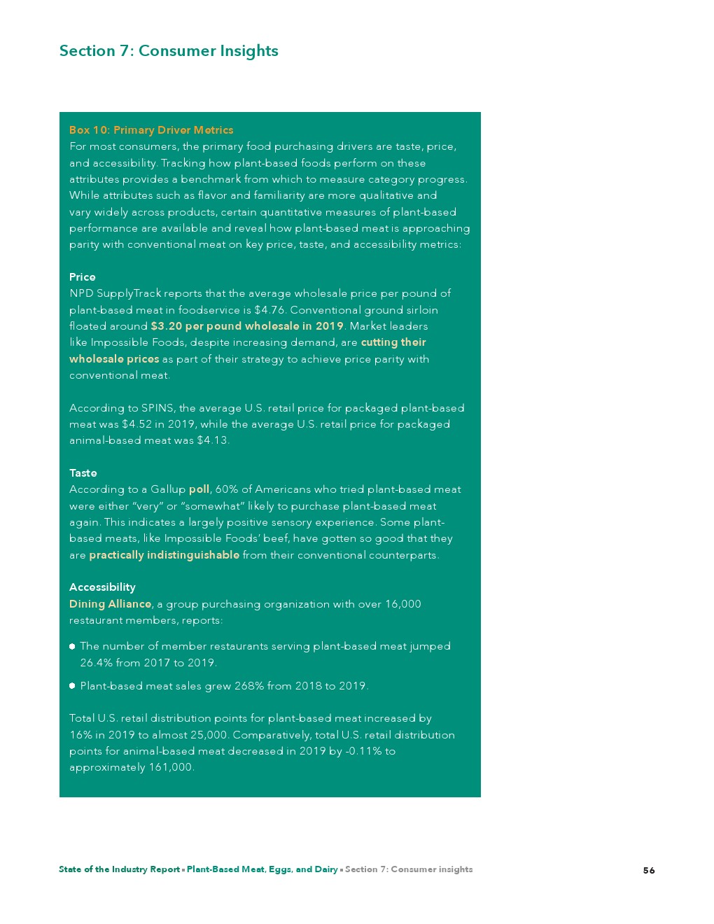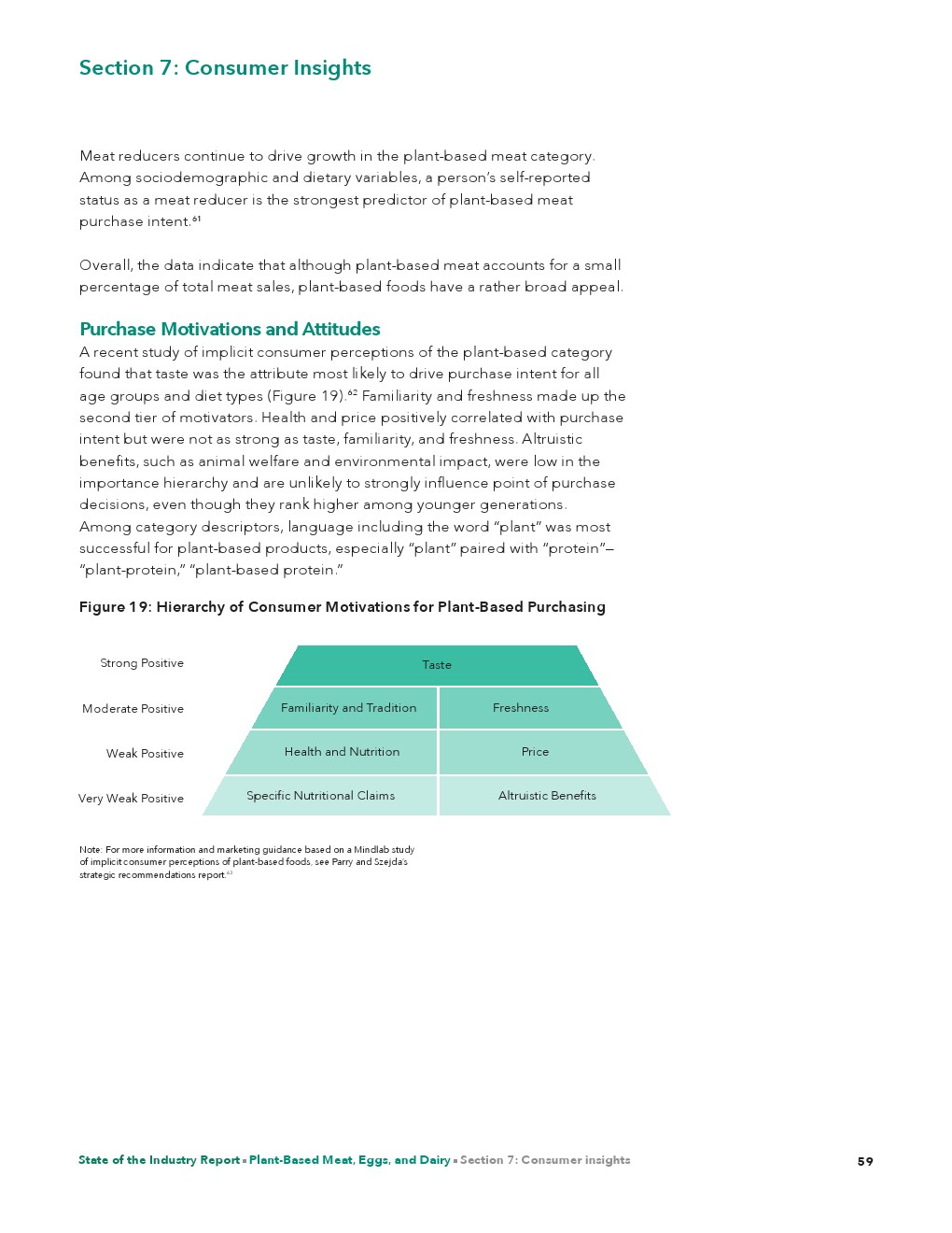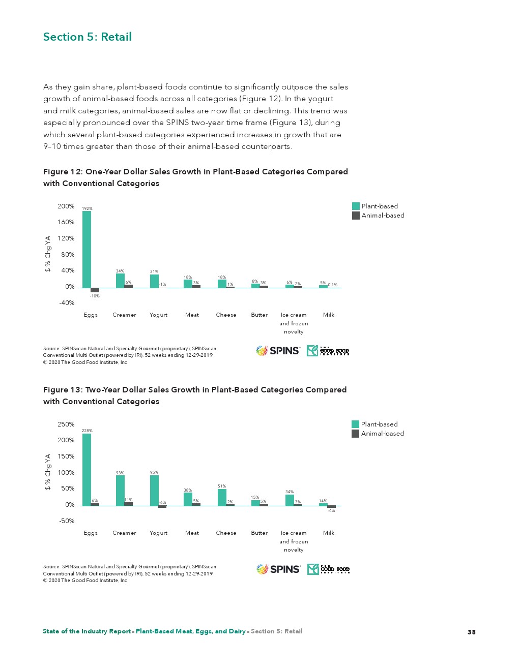 报告评价了2019年美国零售销售额排名前10位的植物性肉、牛奶和奶酪品牌。与去年同期相比,植物性肉类、牛奶和奶酪类别变化不大。前10个品牌中有9个在三个类别中都保持了其2018年零售地位。植物肉类的10个最畅销品牌占零售销售额的89%,在2018年略低于90%。值得注意的是,几乎10个植物性肉类最畅销品牌都专注于匹配产品的动物性肉的味道、质地和外观。这些产品约占植物性肉类通用产品(UPC)的63%,但占该类别销售额的84%,这凸显了消费者对与动物性肉类非常相似的植物性肉类产品的兴趣。
