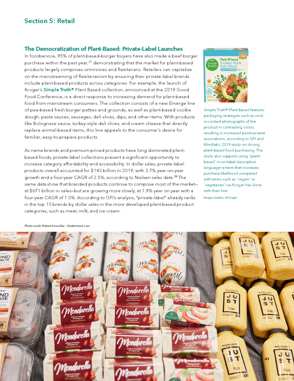 GFI的数据表明,自有品牌销售总额占植物性肉类市场的1.6%。自有品牌产品在更发达的植物性牛奶类别中发挥着更大的作用,自有植物性奶制品品牌占该类别的13.9%。在欠发达的植物性奶酪市场,自有品牌仅占2%。