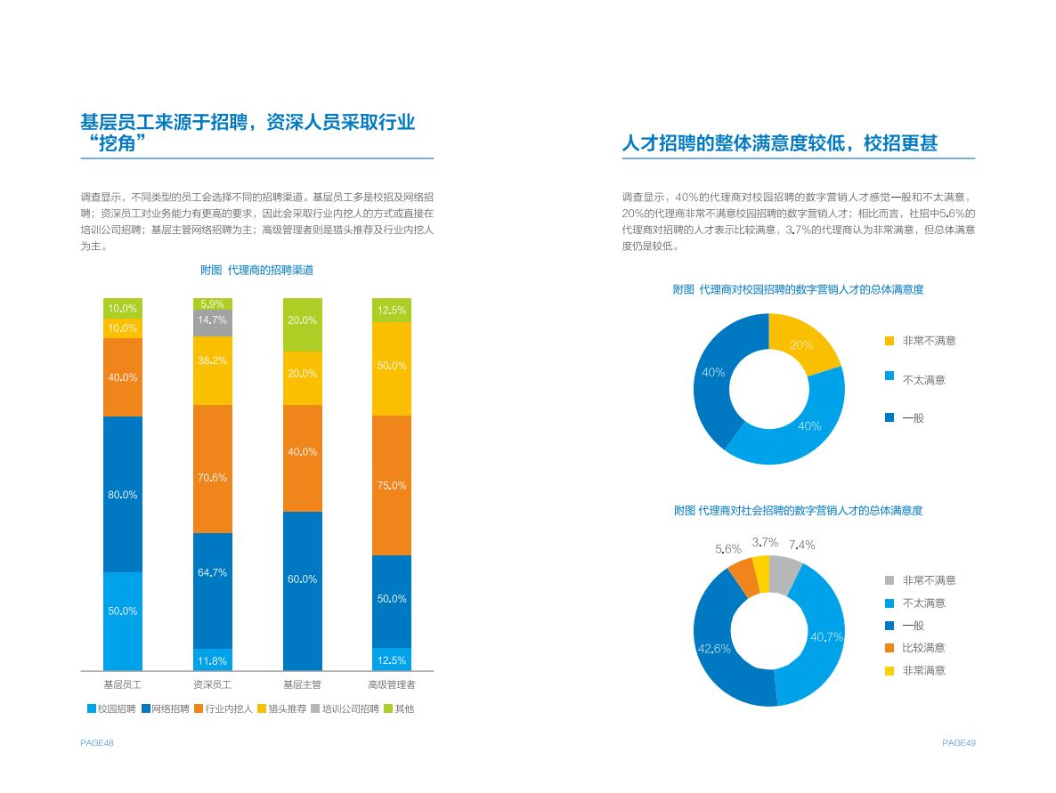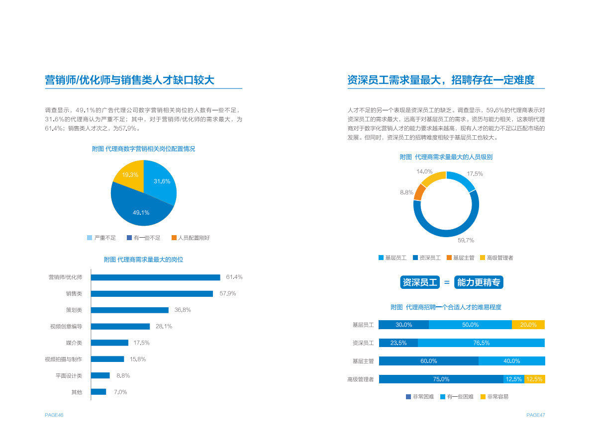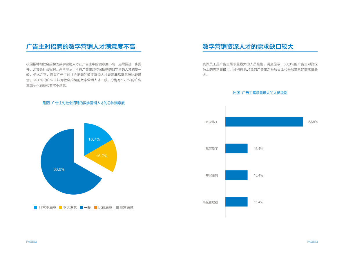 广告主和广告代理商虽然在数字营销岗位设置存在一定差异,但在人才需求上呈现出更广泛的共性,例如营销师/优化师是各方最为紧俏的人才资源,各方都感到无法获得足够的行业资深人才,招聘满意度整体较低。