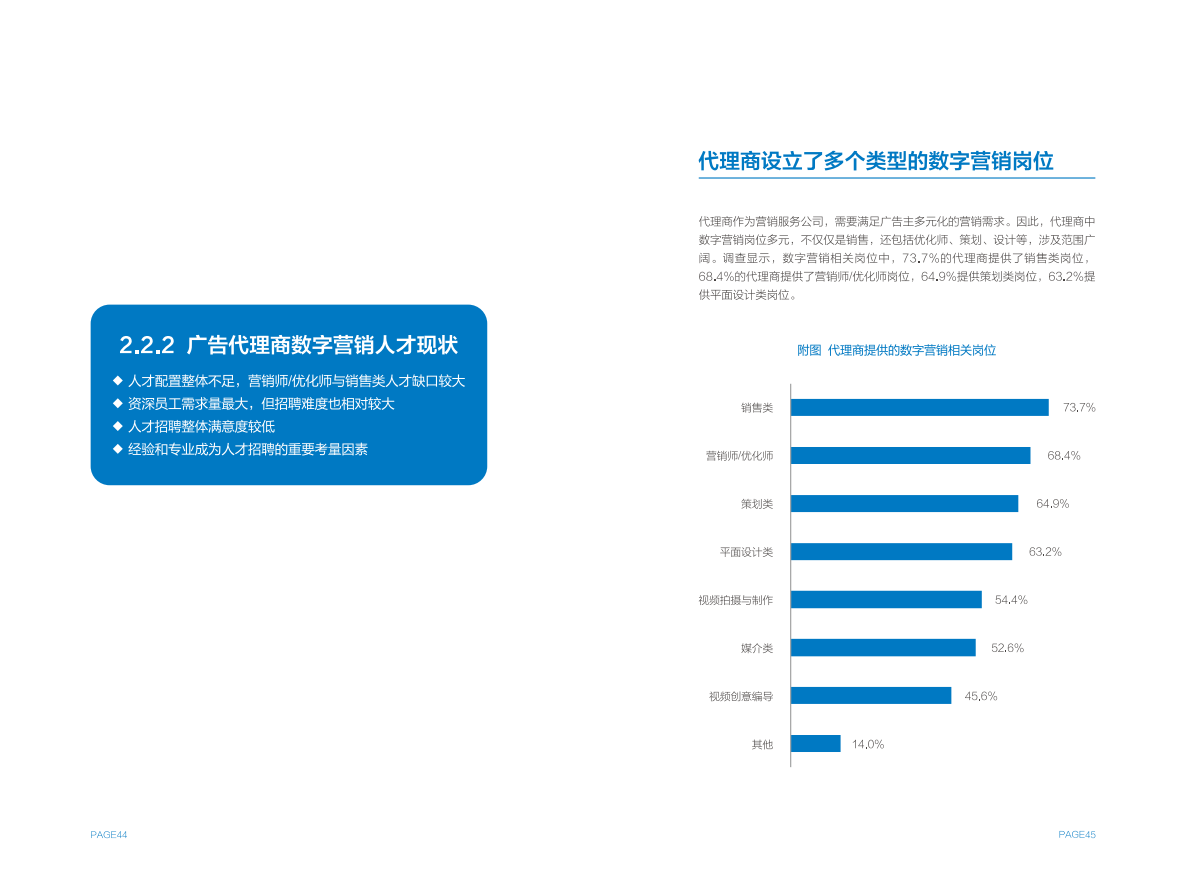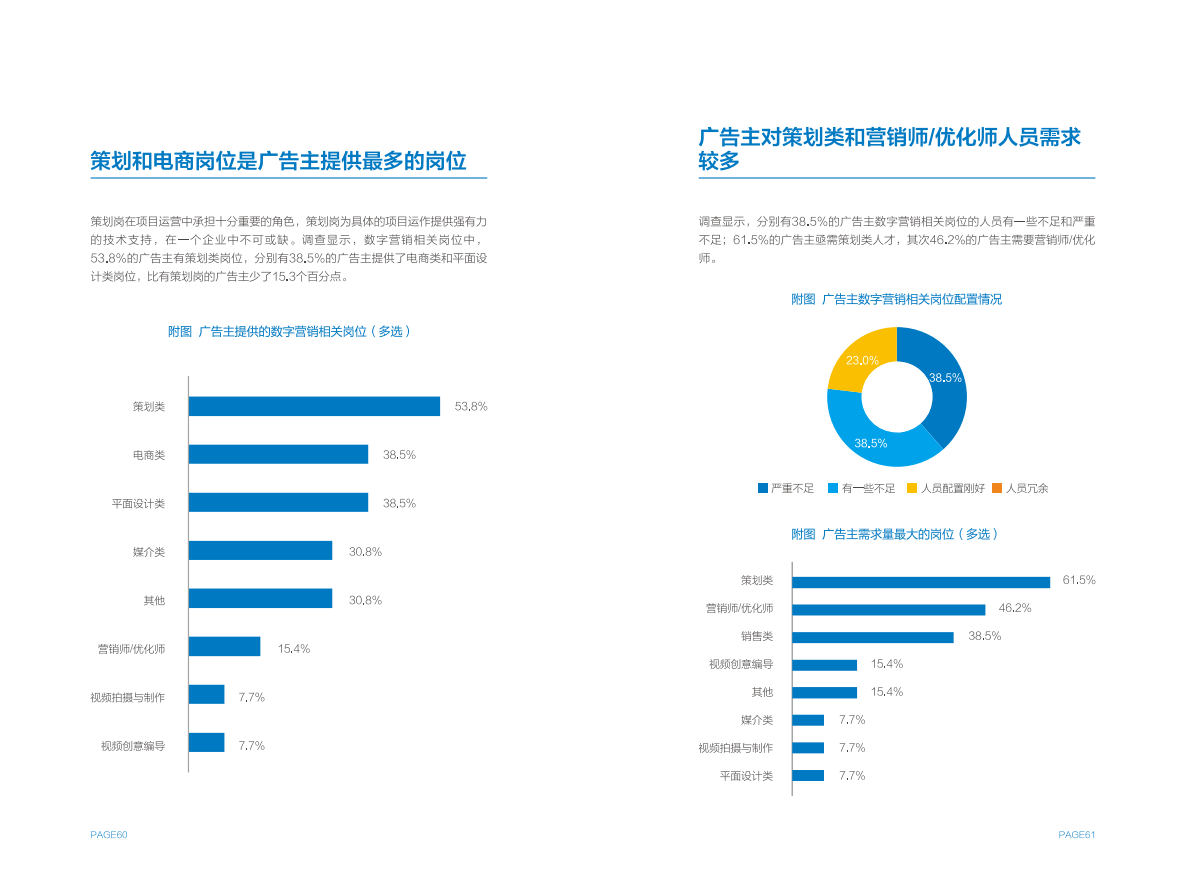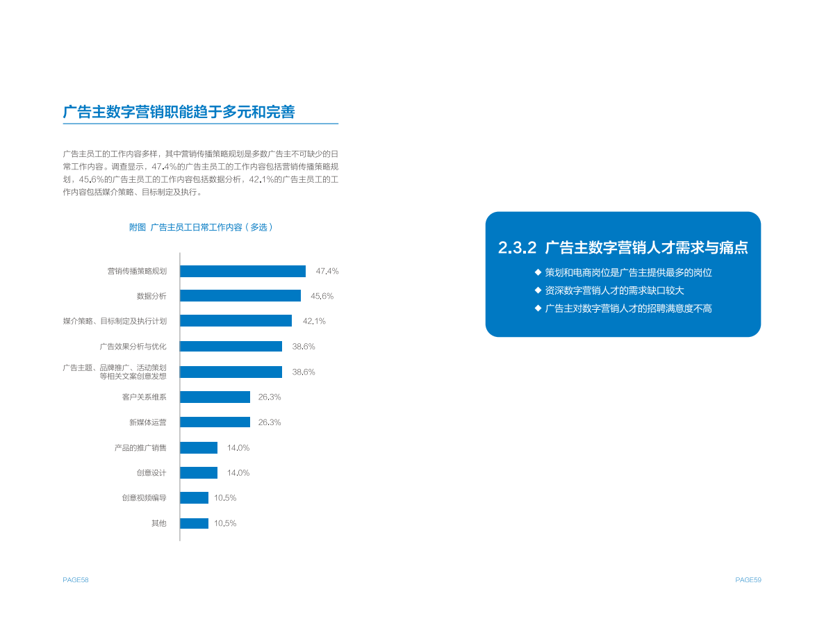 广告主和广告代理商虽然在数字营销岗位设置存在一定差异,但在人才需求上呈现出更广泛的共性,例如营销师/优化师是各方最为紧俏的人才资源,各方都感到无法获得足够的行业资深人才,招聘满意度整体较低。