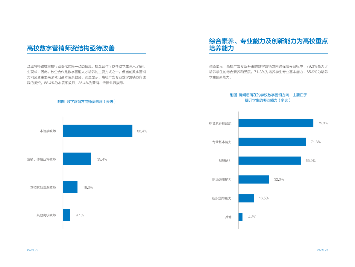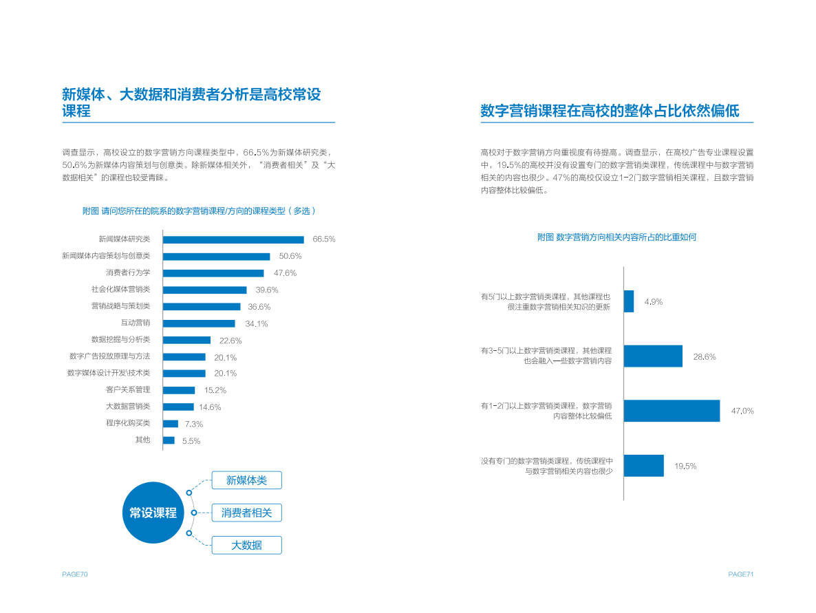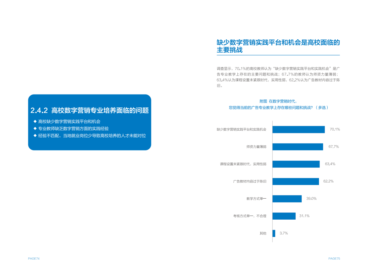 高校方面,作为数字营销人才的重要供给侧,大部分设有广告专业的高校都已细分出数字营销方向,并设置相关课程。但在课程占比、师资力量等方面,尚无法完全匹配行业需求,同时存在缺少实践平台,毕业生经验不能完全满足企业需求的问题。