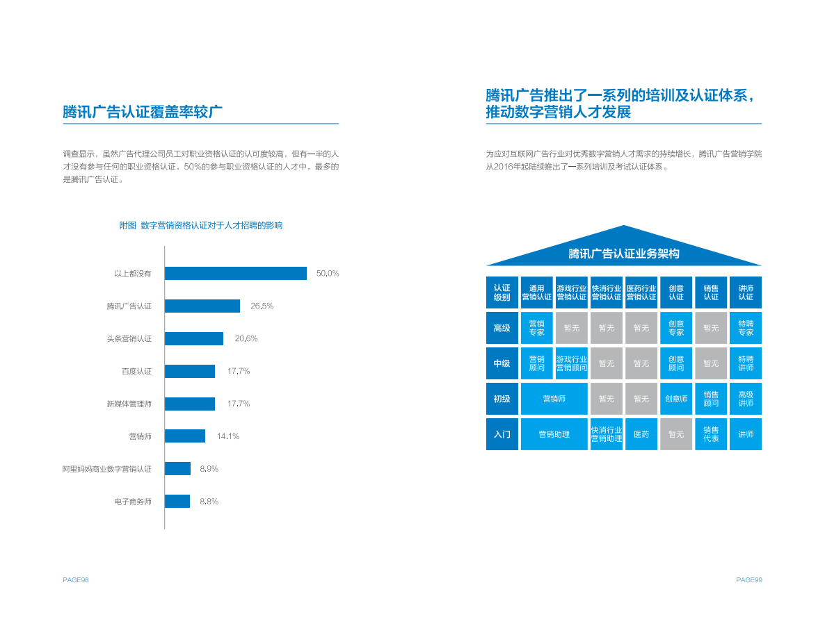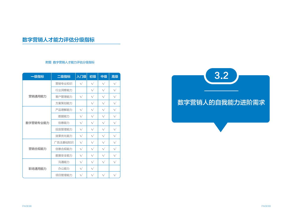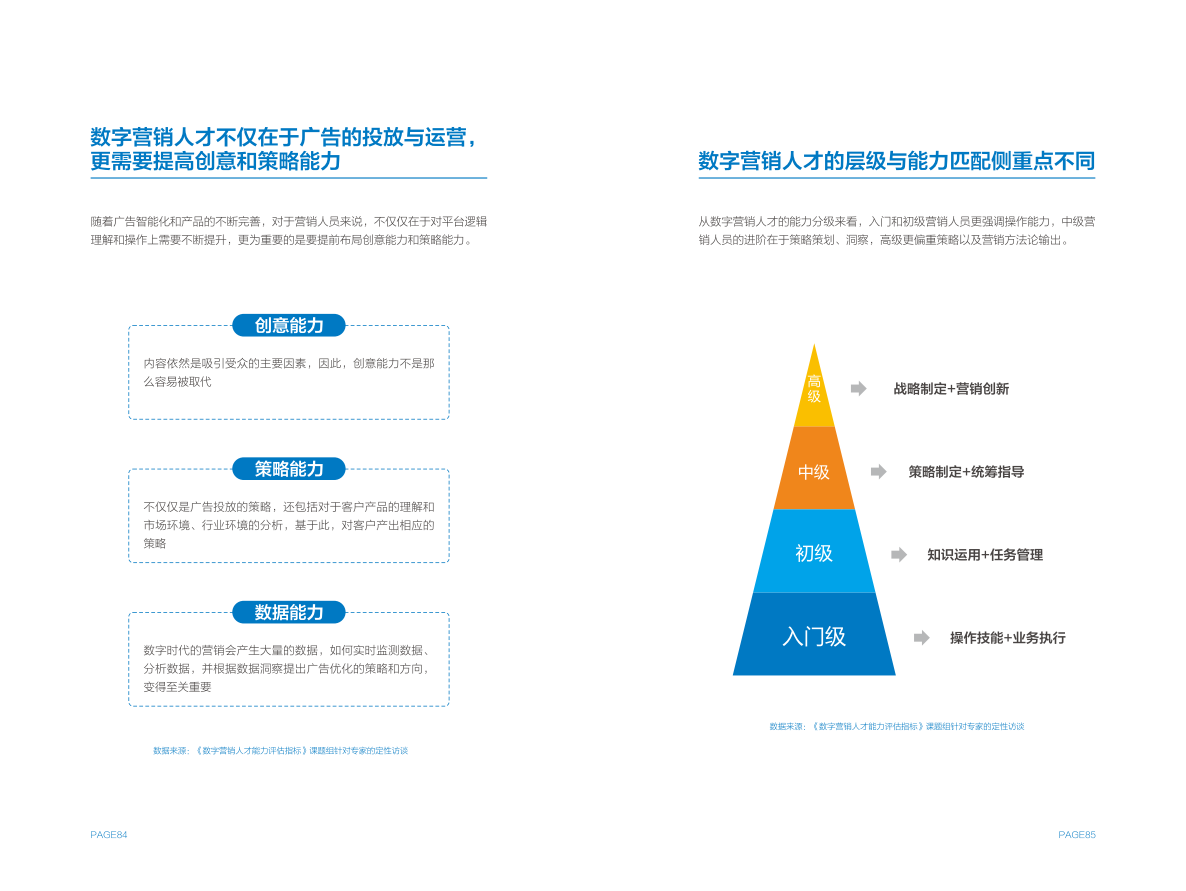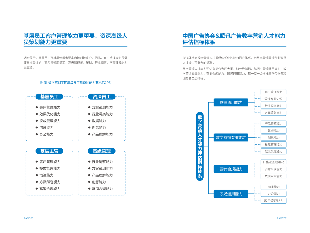 作为人才考量参考标准的中国广告协会&腾讯广告数字营销人才能力评估指标体系,也收入在《报告》中。这一体系综合展现了数字营销从业者一级、二级能力指标,同时也指出了不同层级人才所需匹配的能力重点。