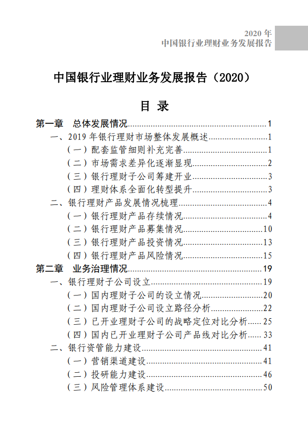 《报告》还指出,银行理财业务作为对接资产端和资金端的桥梁,是实体经济获得资金的重要手段,发挥着金融资源配置的重要作用。在资管新规及其配套细则的影响下,未来银行理财将逐步回归“受人之托,代客理财”的本源,实现脱虚向实,在不断发展中提升服务实体经济能力,助力供给侧结构性改革。2020年是资管新规过渡期最后一年,各银行业金融机构应压实责任,妥善处置存量资产,有序推进理财业务整改工作。未来,银行理财将会进一步加快转型节奏,完善产品体系,打造核心竞争力,加强投资者教育,提升投研能力、科技系统、人力资源的建设水平。作为银行理财市场的主要运行模式,理财公司将迎来有序扩容。同时,随着我国金融业对外开放政策的推进,中外合资理财公司也将陆续获批并开业,这有利于引进国际先进资管机构专业经验,进一步丰富资管市场主体和产品种类,满足投资者多元化服务需求。