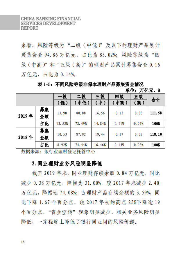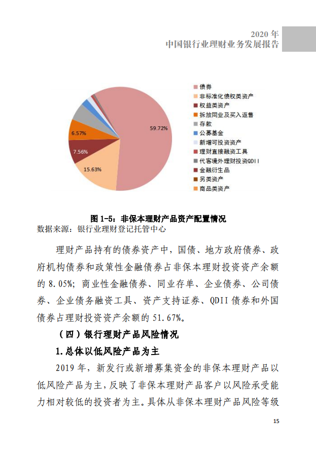 《报告》指出,2019年,为进一步对理财业务落地操作给出指导,银行理财公司净资本管理办法等多项配套监管制度细则相继落地,引导银行对照监管规定,稳妥有序推动理财业务转型升级。在业务转型推进过程中,银行理财产品体系进一步丰富,并出现了养老类、指数型等特色产品,理财业务呈现差异化竞争格局。截至2019年底,全国共有377家银行业金融机构有存续的非保本理财产品,理财产品4.73万只,存续余额23.40万亿元,存续余额较年初增长6.15%。全年开放式产品存续余额16.93万亿元,占全部理财产品存续余额的72.36%,同比上升4.72个百分点。从风险等级来看,新发行理财产品以低风险为主,同时受监管政策影响,净值型产品募集量持续上升,个人类理财产品余额仍然呈现出规模占比高的特征。从资金运用情况来看,债券仍然是理财产品重点配置的资产之一,非保本理财资金配置债券资产比例高达59.72%,占比较年初提高6.37个百分点。