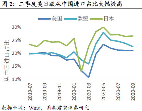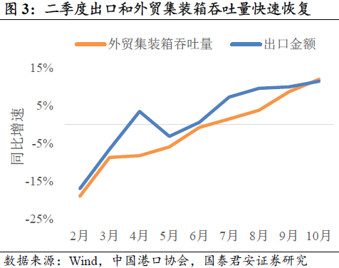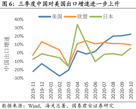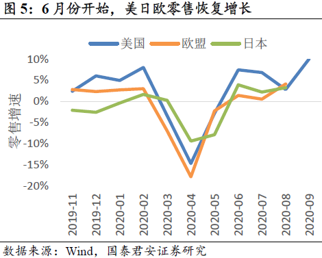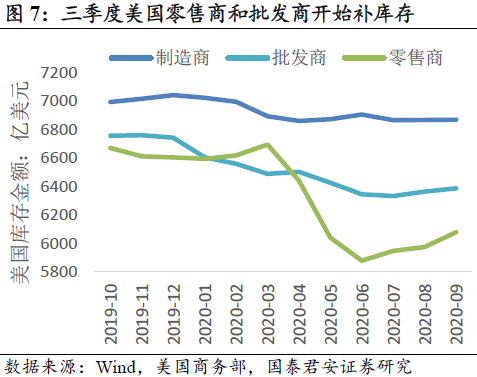 三季度欧美消费恢复,中国出口增速提升。卫生事件期间的大量补贴,使居民可支配收入同比增长,推动消费复苏,6月份开始美日欧零售恢复增长。三季度中国出口增速提高,对美国出口增速明显提升。