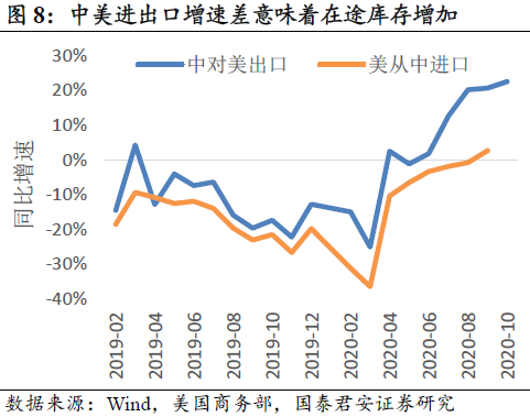 补库存的持续时间有待观察。卫生事件之后,美国零售商去库存持续3个月,批发商和制造商去库存时间略长、但幅度更小。8-10月美国港口的进口集装箱量持续高增长,预计处于补库存阶段。班轮公司预计春节前运量仍将较快增长,未来补库存的持续时间有待观察。原本我们预期10月中下旬北美航线向淡季过度,但目前看来,四季度美国货物净进口增速将高于零售增速。补库存,推动运输需求处于高位。