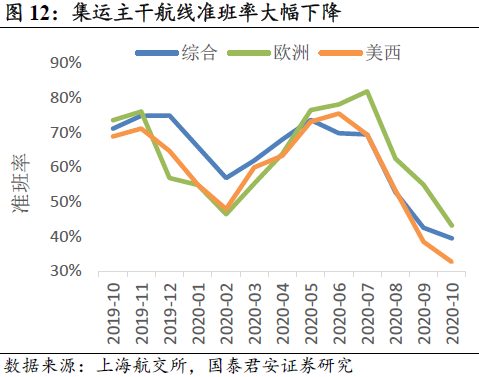 3.紊乱:Q4全球供应链紊乱,运价脱离供求。从全球集装箱运量、中国出口增速、中国枢纽港外贸集装箱吞吐量看,四季度运输需求增速并没有明显提高。但是,欧美供应链产能的弹性极弱,导致全球供应链在高产能利用率阶段出现“紊乱”,表现为港口拥堵、准班率下降和集装箱短缺等问题凸显。供应链的“紊乱”,意味着尽管船公司投入了几乎所有的运力,但有效供给环比下降。