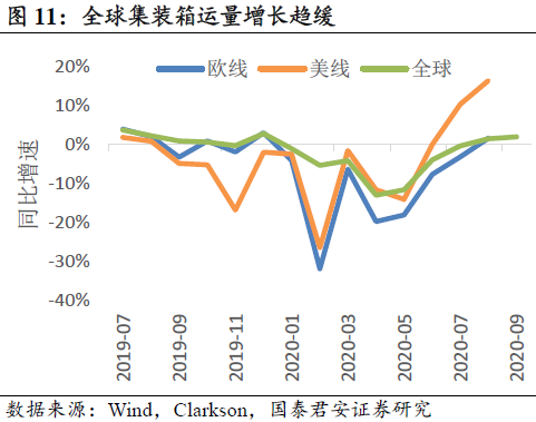 二季度中国出口替代,推动集运需求超预期增长。卫生事件发生后,中国率先复产复工,中国出口替代欧美国产与其他国家出口。全球集运需求总量下滑,但中国份额提升,Q2出口恢复增长。