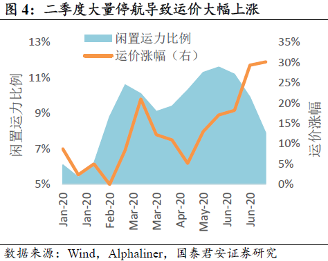 船舶大量停航,导致运价大幅上涨。班轮公司对需求悲观预期下大量停航,二季度运营的船舶运力大幅缩减。但是需求超预期增长,导致运价大幅上涨。
