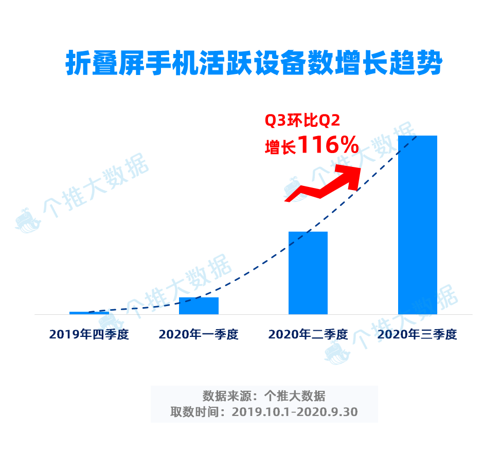 每日互动个推大数据洞察发现,自2019年四季度开始折叠屏手机活跃设备数迅速增长。从近期的增长情况看,2020年三季度较二季度而言,折叠屏手机活跃设备数增长了116%。