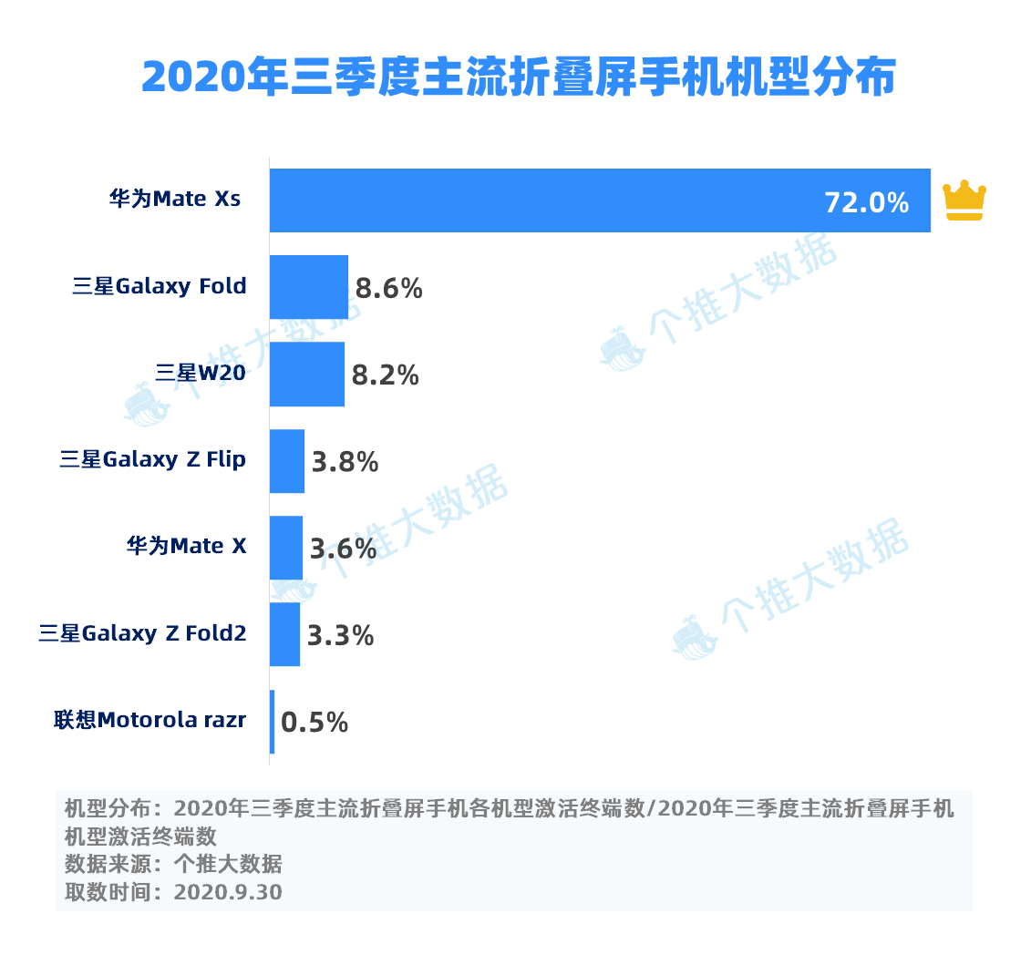 在国内主流折叠屏手机市场中,数据显示,截至2020年三季度,华为Mate Xs以72.0%的占比排名第一,而老一代的华为Mate X以3.6%的占比排名第五。三星在主流折叠屏机型数量上更占优势,2019年2月发布的三星Galaxy Fold以8.6%的占比排名第二,同年11月三星发布的W20以8.2%的占比位列第三,三星另外两款折叠屏手机Galaxy Z Flip和Galaxy Z Fold2,分别于今年8月和9月上市,占据第四名和第六名。联想也于2020年9月加入折叠屏手机市场,发布的Motorola razr以0.5%的占比位列第七。