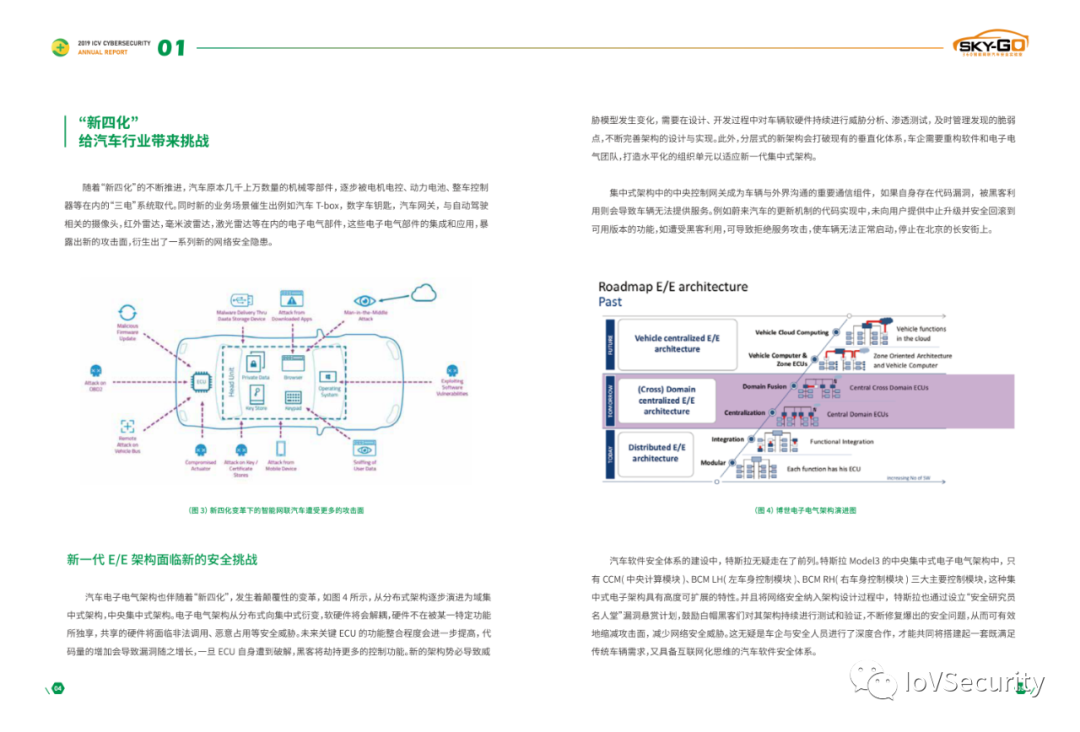 随着“新四化”的不断推进,汽车原本几千上万数量的机械零部件,逐步被电机电控、动力电池、整车控制器等在内的“三电”系统取代。同时新的业务场景催生出例如汽车 T-box,数字车钥匙等在内的电子电气部件,这又衍生出了一系列新的网络安全隐患。《报告》从新一代 E/E 架构面临新的安全挑战以及自动驾驶算法与传感器面临的安全挑战两方面进行了整体分析。