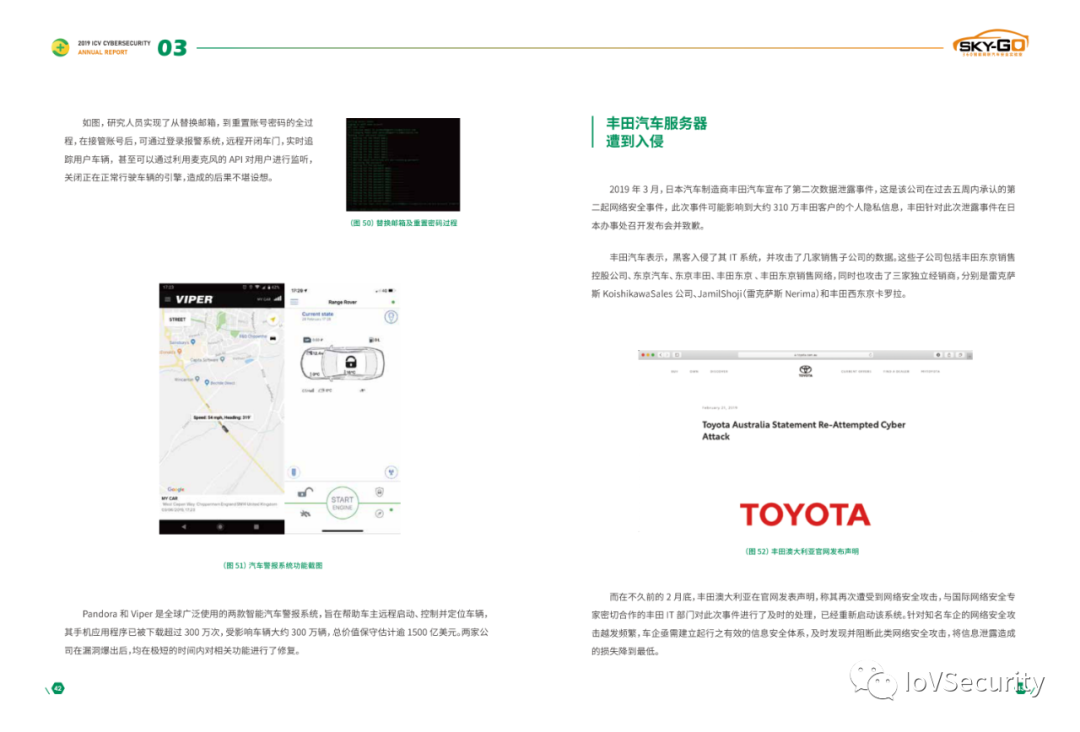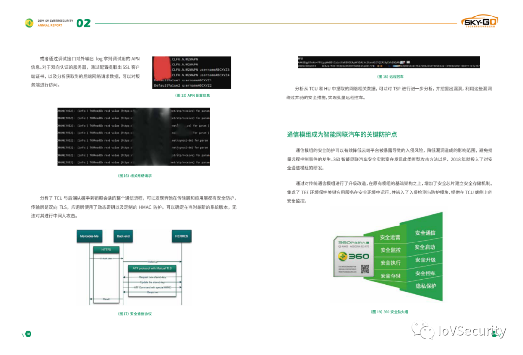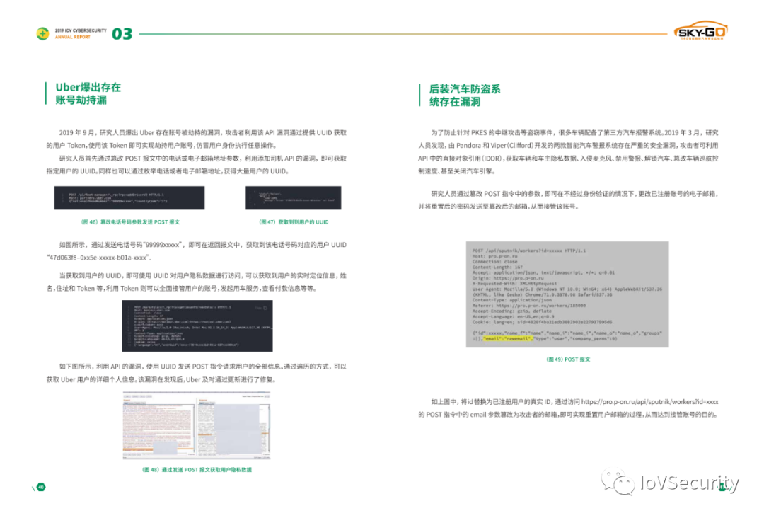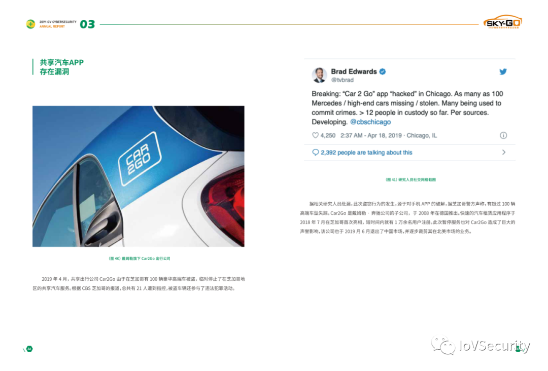 2019年,智能网联汽车全球范围内出现了十大安全事件,包括基于通信模组的远程控制劫持攻击,基于生成式对抗网络(GAN)自动驾驶算法攻击,特斯拉PKES系统存在中继攻击威胁,特斯拉Model S/X WiFi协议存在缓存区溢出漏洞,共享汽车APP存在漏洞,基于激光雷达的自动驾驶系统安全性存疑,Uber爆出存在账号劫持漏洞,后装汽车防盗系统存在漏洞,丰田汽车服务器遭到入侵,宝马遭受APT攻击。
