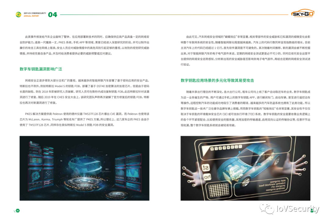 2019年,车联网出现了两种新型攻击方式,大部分车厂将失守,数字车钥匙漏洞也打开了汽车安全的潘多拉盒子,而汽车网络安全的黄金分割点在于对供应商的安全管理,《报告》建议车联网安全要从正反两面去考虑,做主动防御。